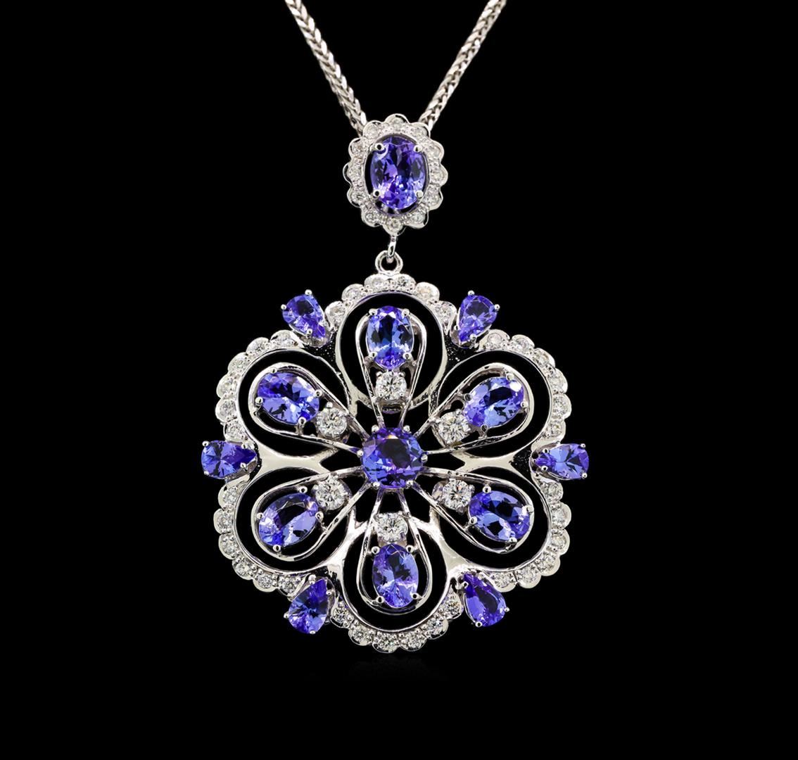 One electronically tested 14KT white gold ladies cast tanzanite and diamond pendant & chain 20.0" long, with a lobster claw clasp with a bright polish finish. Identified with markings of "14K". Condition is new. Containing: One prong set oval modified brilliant cut natural tanzanite, measuring 7.50 x 6.00. x 3.90mm, approximate weight of 1.23ct., clarity is eye clean, type I, medium light, very slightly grayish, violet color, (GIA V 4/3), cut is good. Six prong set oval modified brilliant cut natural tanzanites, measuring 7.00. x 5.00. x 3.25mm, approximate total weight of 4.80ct., clarity is eye clean, type I, medium light, very slightly grayish, violet color, (GIA V 4/3), cut is good. Six prong set pear modified brilliant cut natural tanzanites, measuring 5.00. x 3.00. x 1.95mm, approximate total weight of 1.20ct., clarity is eye clean, type I, medium light, very slightly grayish, violet color, (GIA V 4/3), cut is good. One prong set round modified brilliant cut natural tanzanite, measuring 6.50 - 6.50 x 4.22 mm, approximate weight of 1.19ct., clarity is eye clean, type I, medium light, very slightly grayish, violet color, (GIA V 4/3), cut is good. Six prong set round brilliant cut diamonds, measuring 3.10 - 3.10 x 1.86mm (depth est.) approximate total weight of 6 Stones = 0.65ct. Clarity: SI-1 to SI-2. Color: I - J, Cut is Good. Forty-Eight prong set round brilliant cut diamonds, measuring 1.30 - 1.30 x 0.78mm (depth est.) approximate total weight of 48 Stones = 0.38ct. Clarity: SI-1 to SI-2. Color: I - J, Cut is Good. Colored gemstones are presumed to have been subjected to commonly used enhancement processes. All diamonds and colored gemstones are graded in the mounting, unless otherwise stated. Total Weight of Colored Stones 8.42ct. Total Weight of Diamonds 1.04ct. Total Weight of Pendant & Chain 16.90 grams. GGL Appraised at $7,810.00.