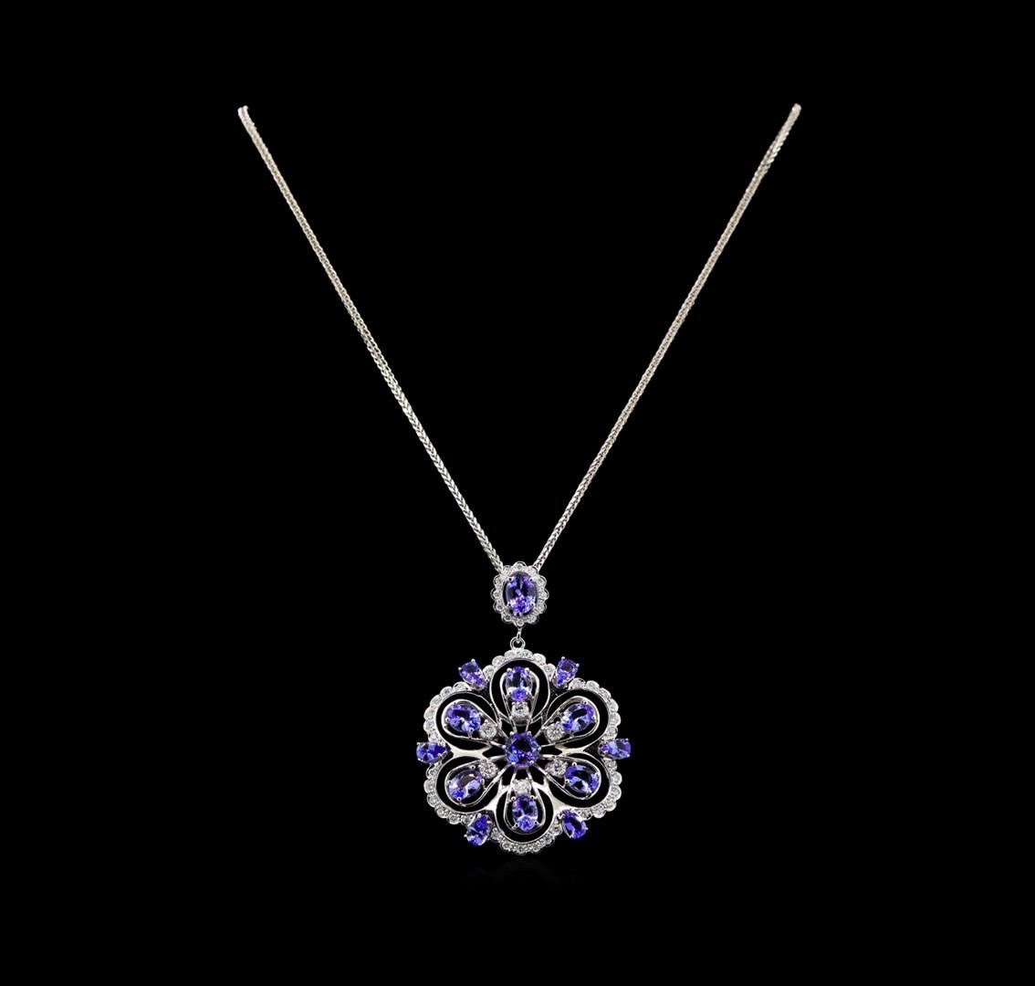 One electronically tested 14KT white gold ladies cast tanzanite and diamond pendant & chain 20.0" long, with a lobster claw clasp with a bright polish finish. Identified with markings of "14K". Condition is new. Containing: One prong set oval modified brilliant cut natural tanzanite, measuring 7.50 x 6.00. x 3.90mm, approximate weight of 1.23ct., clarity is eye clean, type I, medium light, very slightly grayish, violet color, (GIA V 4/3), cut is good. Six prong set oval modified brilliant cut natural tanzanites, measuring 7.00. x 5.00. x 3.25mm, approximate total weight of 4.80ct., clarity is eye clean, type I, medium light, very slightly grayish, violet color, (GIA V 4/3), cut is good. Six prong set pear modified brilliant cut natural tanzanites, measuring 5.00. x 3.00. x 1.95mm, approximate total weight of 1.20ct., clarity is eye clean, type I, medium light, very slightly grayish, violet color, (GIA V 4/3), cut is good. One prong set round modified brilliant cut natural tanzanite, measuring 6.50 - 6.50 x 4.22 mm, approximate weight of 1.19ct., clarity is eye clean, type I, medium light, very slightly grayish, violet color, (GIA V 4/3), cut is good. Six prong set round brilliant cut diamonds, measuring 3.10 - 3.10 x 1.86mm (depth est.) approximate total weight of 6 Stones = 0.65ct. Clarity: SI-1 to SI-2. Color: I - J, Cut is Good. Forty-Eight prong set round brilliant cut diamonds, measuring 1.30 - 1.30 x 0.78mm (depth est.) approximate total weight of 48 Stones = 0.38ct. Clarity: SI-1 to SI-2. Color: I - J, Cut is Good. Colored gemstones are presumed to have been subjected to commonly used enhancement processes. All diamonds and colored gemstones are graded in the mounting, unless otherwise stated. Total Weight of Colored Stones 8.42ct. Total Weight of Diamonds 1.04ct. Total Weight of Pendant & Chain 16.90 grams. GGL Appraised at $7,810.00.