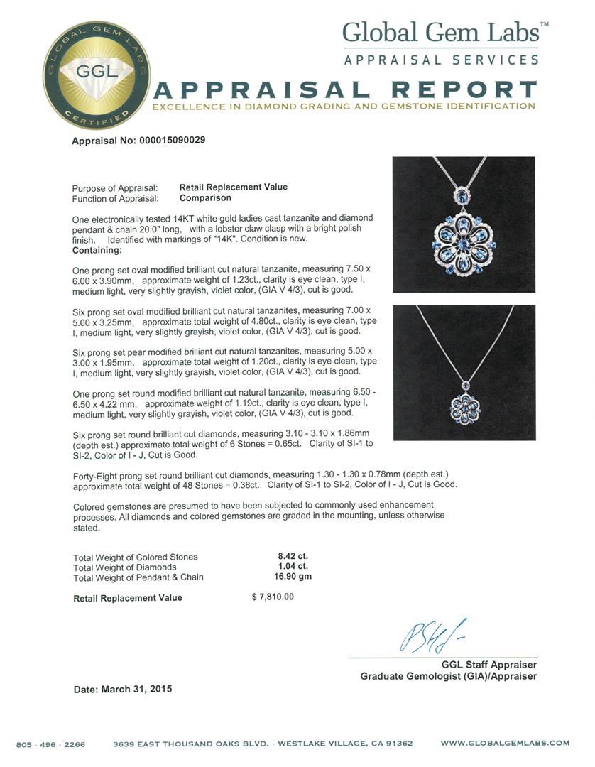One electronically tested 14KT white gold ladies cast tanzanite and diamond pendant & chain 20.0" long, with a lobster claw clasp with a bright polish finish. Identified with markings of "14K". Condition is new. Containing: One prong set oval modified brilliant cut natural tanzanite, measuring 7.50 x 6.00. x 3.90mm, approximate weight of 1.23ct., clarity is eye clean, type I, medium light, very slightly grayish, violet color, (GIA V 4/3), cut is good. Six prong set oval modified brilliant cut natural tanzanites, measuring 7.00. x 5.00. x 3.25mm, approximate total weight of 4.80ct., clarity is eye clean, type I, medium light, very slightly grayish, violet color, (GIA V 4/3), cut is good. Six prong set pear modified brilliant cut natural tanzanites, measuring 5.00. x 3.00. x 1.95mm, approximate total weight of 1.20ct., clarity is eye clean, type I, medium light, very slightly grayish, violet color, (GIA V 4/3), cut is good. One prong set round modified brilliant cut natural tanzanite, measuring 6.50 - 6.50 x 4.22 mm, approximate weight of 1.19ct., clarity is eye clean, type I, medium light, very slightly grayish, violet color, (GIA V 4/3), cut is good. Six prong set round brilliant cut diamonds, measuring 3.10 - 3.10 x 1.86mm (depth est.) approximate total weight of 6 Stones = 0.65ct. Clarity: SI-1 to SI-2. Color: I - J, Cut is Good. Forty-Eight prong set round brilliant cut diamonds, measuring 1.30 - 1.30 x 0.78mm (depth est.) approximate total weight of 48 Stones = 0.38ct. Clarity: SI-1 to SI-2. Color: I - J, Cut is Good. Colored gemstones are presumed to have been subjected to commonly used enhancement processes. All diamonds and colored gemstones are graded in the mounting, unless otherwise stated. Total Weight of Colored Stones 8.42ct. Total Weight of Diamonds 1.04ct. Total Weight of Pendant & Chain 16.90 grams. GGL Appraised at $7,810.00.