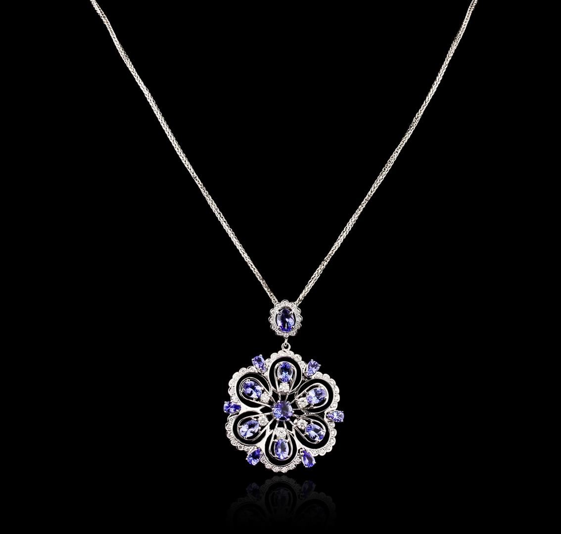 One electronically tested 14KT white gold ladies cast tanzanite and diamond pendant & chain 20.0" long, with a lobster claw clasp with a bright polish finish. Identified with markings of "14K". Condition is new. Containing: One prong set oval modified brilliant cut natural tanzanite, measuring 7.50 x 6.00. x 3.90mm, approximate weight of 1.23ct., clarity is eye clean, type I, medium light, very slightly grayish, violet color, (GIA V 4/3), cut is good. Six prong set oval modified brilliant cut natural tanzanites, measuring 7.00. x 5.00. x 3.25mm, approximate total weight of 4.80ct., clarity is eye clean, type I, medium light, very slightly grayish, violet color, (GIA V 4/3), cut is good. Six prong set pear modified brilliant cut natural tanzanites, measuring 5.00. x 3.00. x 1.95mm, approximate total weight of 1.20ct., clarity is eye clean, type I, medium light, very slightly grayish, violet color, (GIA V 4/3), cut is good. One prong set round modified brilliant cut natural tanzanite, measuring 6.50 - 6.50 x 4.22 mm, approximate weight of 1.19ct., clarity is eye clean, type I, medium light, very slightly grayish, violet color, (GIA V 4/3), cut is good. Six prong set round brilliant cut diamonds, measuring 3.10 - 3.10 x 1.86mm (depth est.) approximate total weight of 6 Stones = 0.65ct. Clarity: SI-1 to SI-2. Color: I - J, Cut is Good. Forty-Eight prong set round brilliant cut diamonds, measuring 1.30 - 1.30 x 0.78mm (depth est.) approximate total weight of 48 Stones = 0.38ct. Clarity: SI-1 to SI-2. Color: I - J, Cut is Good. Colored gemstones are presumed to have been subjected to commonly used enhancement processes. All diamonds and colored gemstones are graded in the mounting, unless otherwise stated. Total Weight of Colored Stones 8.42ct. Total Weight of Diamonds 1.04ct. Total Weight of Pendant & Chain 16.90 grams. GGL Appraised at $7,810.00.