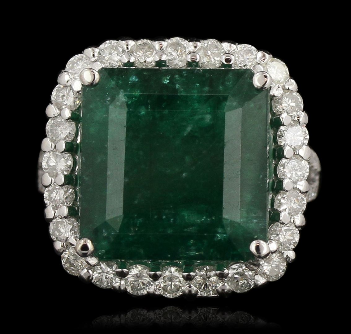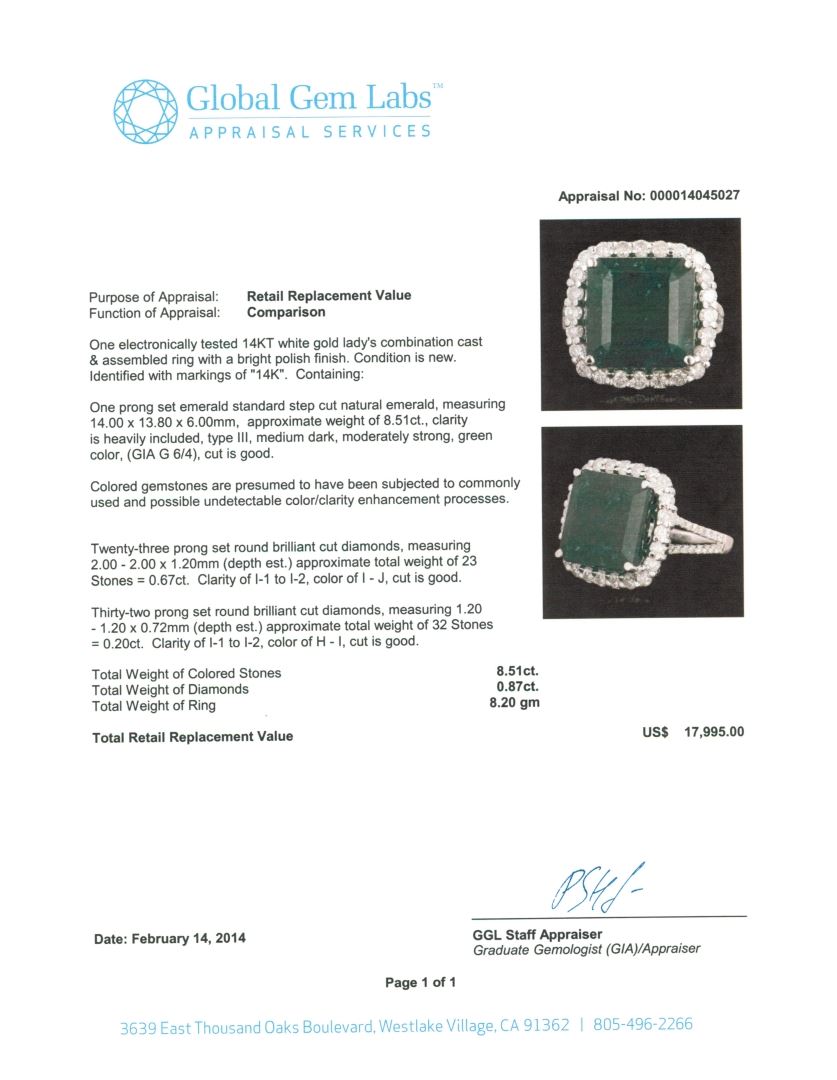One electronically tested 14KT white gold Ladies combination cast & assembled ring with a bright polish finish. Condition is new. Identified with markings of "14K". Containing: One prong set emerald standard step cut natural emerald, measuring 14.00 x 13.80 x 6.00mm, approximate weight of 8.51ct., clarity is heavily included, type III, medium dark, moderately strong, green color, (GIA G 6/4), cut is good. Colored gemstones are presumed to have been subjected to commonly used and possible undetectable color/clarity enhancement processes. Twenty-Three prong set round brilliant cut diamonds, measuring 2.00 - 2.00 x 1.20mm (depth est.) approximate total weight of 23 Stones = 0.67ct. Clarity of I-1 to I-2, Color of I - J, Cut is Good. Thirty-Two prong set round brilliant cut diamonds, measuring 1.20 - 1.20 x 0.72mm (depth est.) approximate total weight of 32 Stones = 0.20ct. Clarity of I-1 to I-2, Color of H - I, Cut is Good. Total Weight of Colored Stones 8.51ct. Total Weight of Diamonds 0.87ct. Total Weight of Ring 8.20gm. GGL Appraised at $17,995.00.