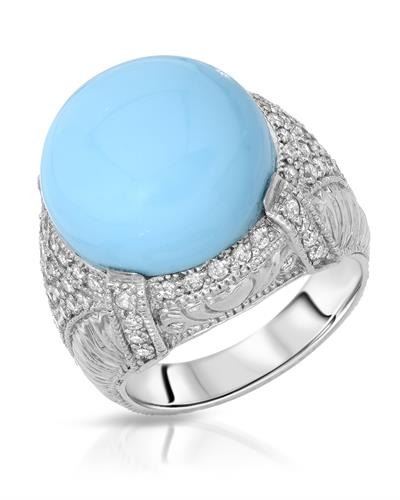14KT White Gold 8.57ct Turquoise and Diamond Ring. (1) Turquoise stone with a total weight of 8.57cts. (72) round Diamonds with a total weight of 0.87cts with a color of I and clarity of I-1. Total weight of this ring is 9.26 grams.