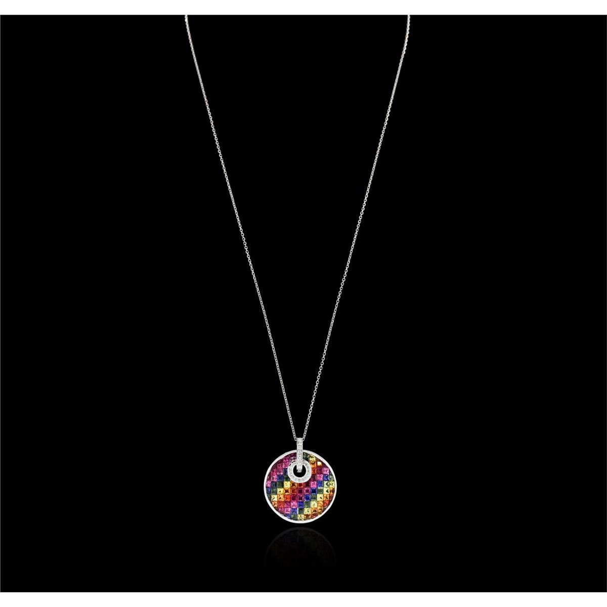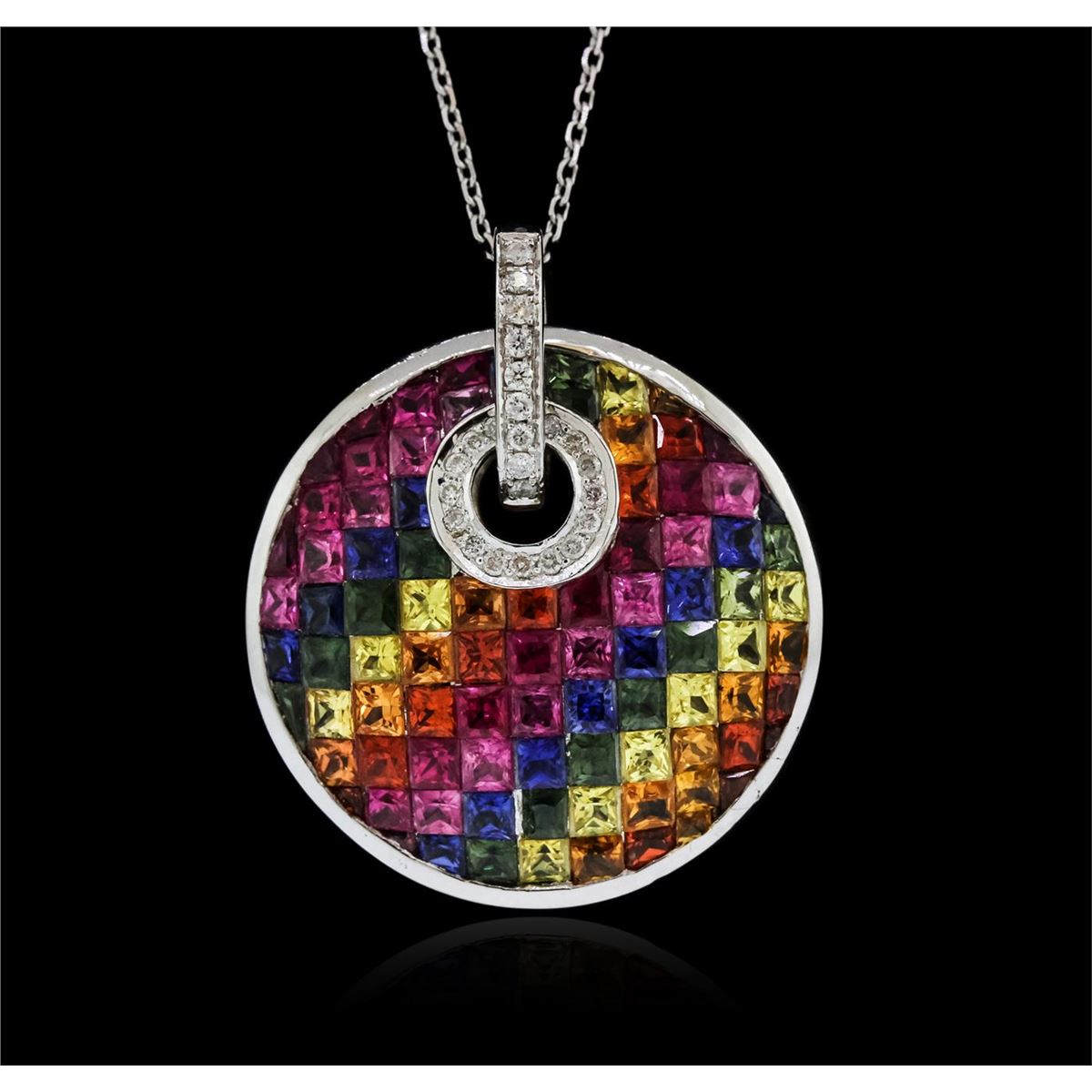 One pendant with chain featuring: 14KT white gold weighing 7.90 grams containing multicolor sapphires with a total weight of 8.62ct and diamonds with a total weight of 0.17ct.