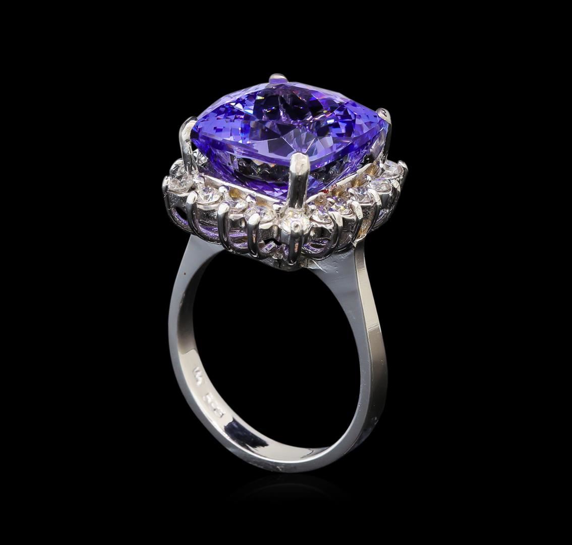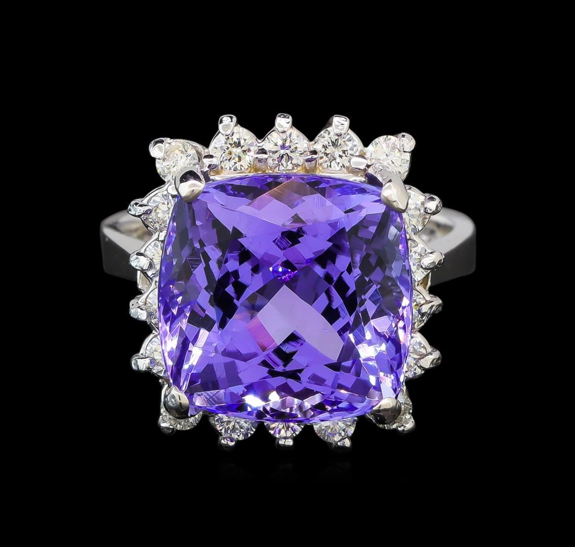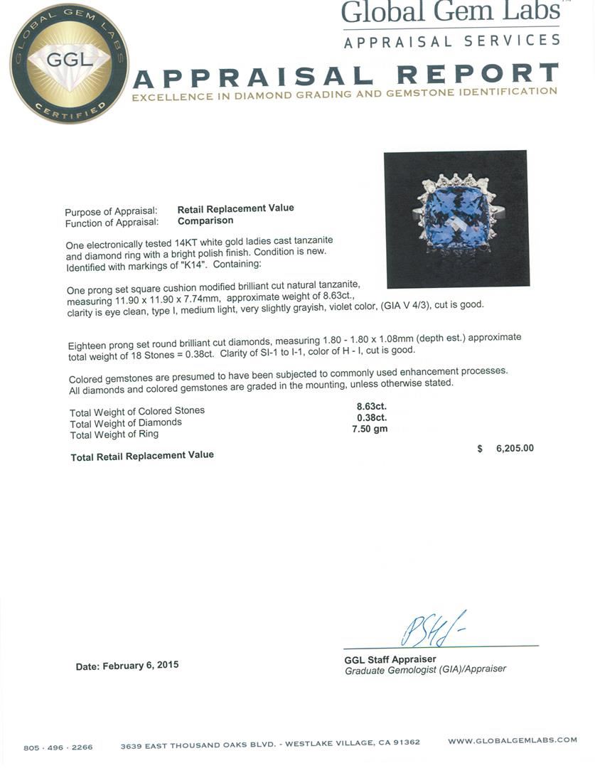 One electronically tested 14KT white gold ladies cast tanzanite and diamond ring with a bright polish finish. Identified with markings of "K14". Condition is new. Containing: One prong set square cushion modified brilliant cut natural tanzanite, measuring 11.90 x 11.90 x 7.74mm, approximate weight of 8.63ct., clarity is eye clean, type I, medium light, very slightly grayish, violet color, (GIA V 4/3), cut is good. Eighteen prong set round brilliant cut diamonds, measuring 1.80 - 1.80 x 1.08mm (depth est.) approximate total weight of 18 Stones = 0.38ct. Clarity: SI-1 to I-1. Color: H - I, Cut is Good. Colored gemstones are presumed to have been subjected to commonly used enhancement processes. All diamonds and colored gemstones are graded in the mounting, unless otherwise stated. Total Weight of Colored Stones 8.63ct. Total Weight of Diamonds 0.38ct. Total Weight of Ring 7.50 grams. GGL Appraised at $6,205.00.