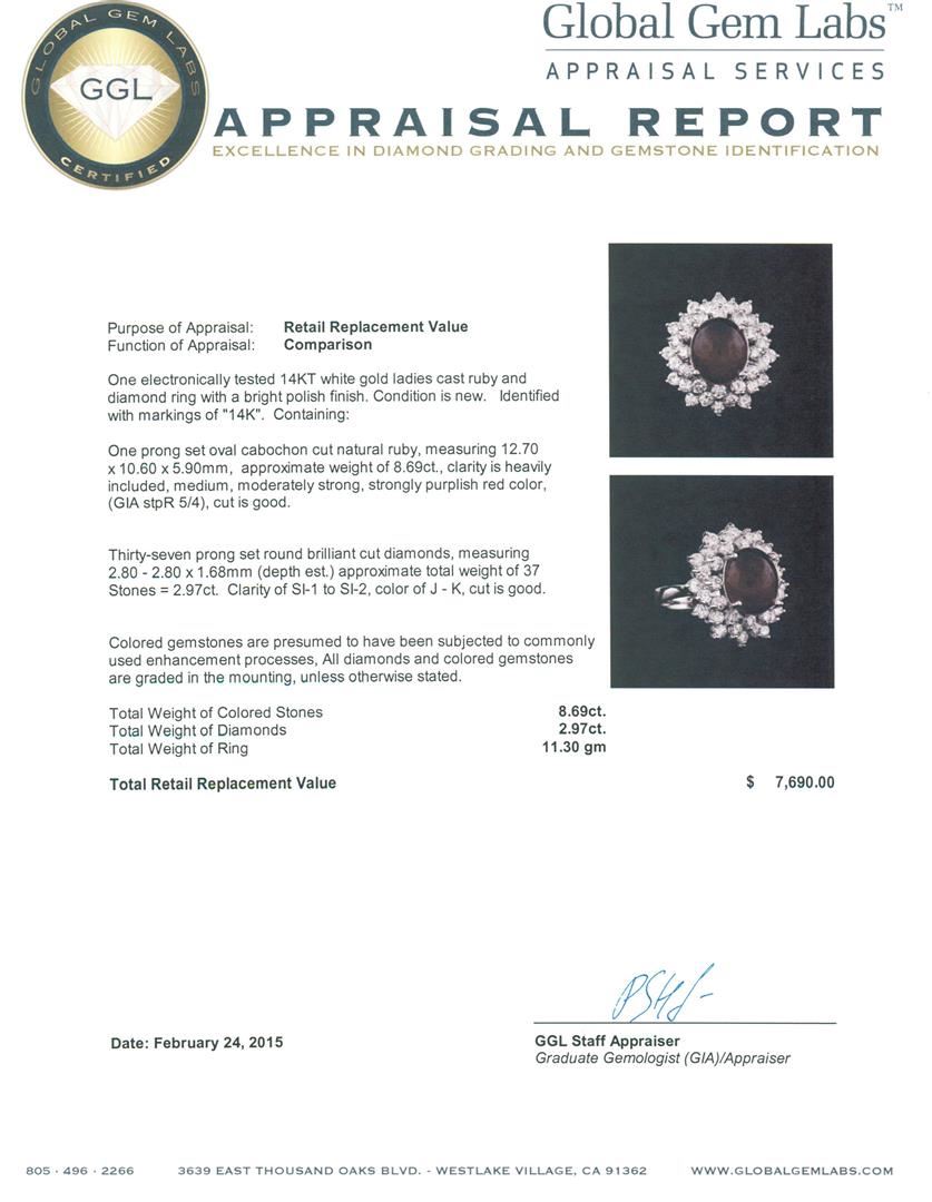One electronically tested 14KT white gold ladies cast ruby and diamond ring with a bright polish finish. Identified with markings of "14K". Condition is new. Containing: One prong set oval cabochon cut natural ruby, measuring 12.70 x 10.60 x 5.90mm, approximate weight of 8.69ct., clarity is heavily included, medium, moderately strong, strongly purplish red color, (GIA stpR 5/4), cut is good. Thirty-Seven prong set round brilliant cut diamonds, measuring 2.80 - 2.80 x 1.68mm (depth est.) approximate total weight of 37 Stones = 2.97ct. Clarity: SI-1 to SI-2. Color: J - K, Cut is Good. Colored gemstones are presumed to have been subjected to commonly used enhancement processes, All diamonds and colored gemstones are graded in the mounting, unless otherwise stated. Total Weight of Colored Stones 8.69ct. Total Weight of Diamonds 2.97ct. Total Weight of Ring 11.30 grams. GGL Appraised at $7,690.00.
