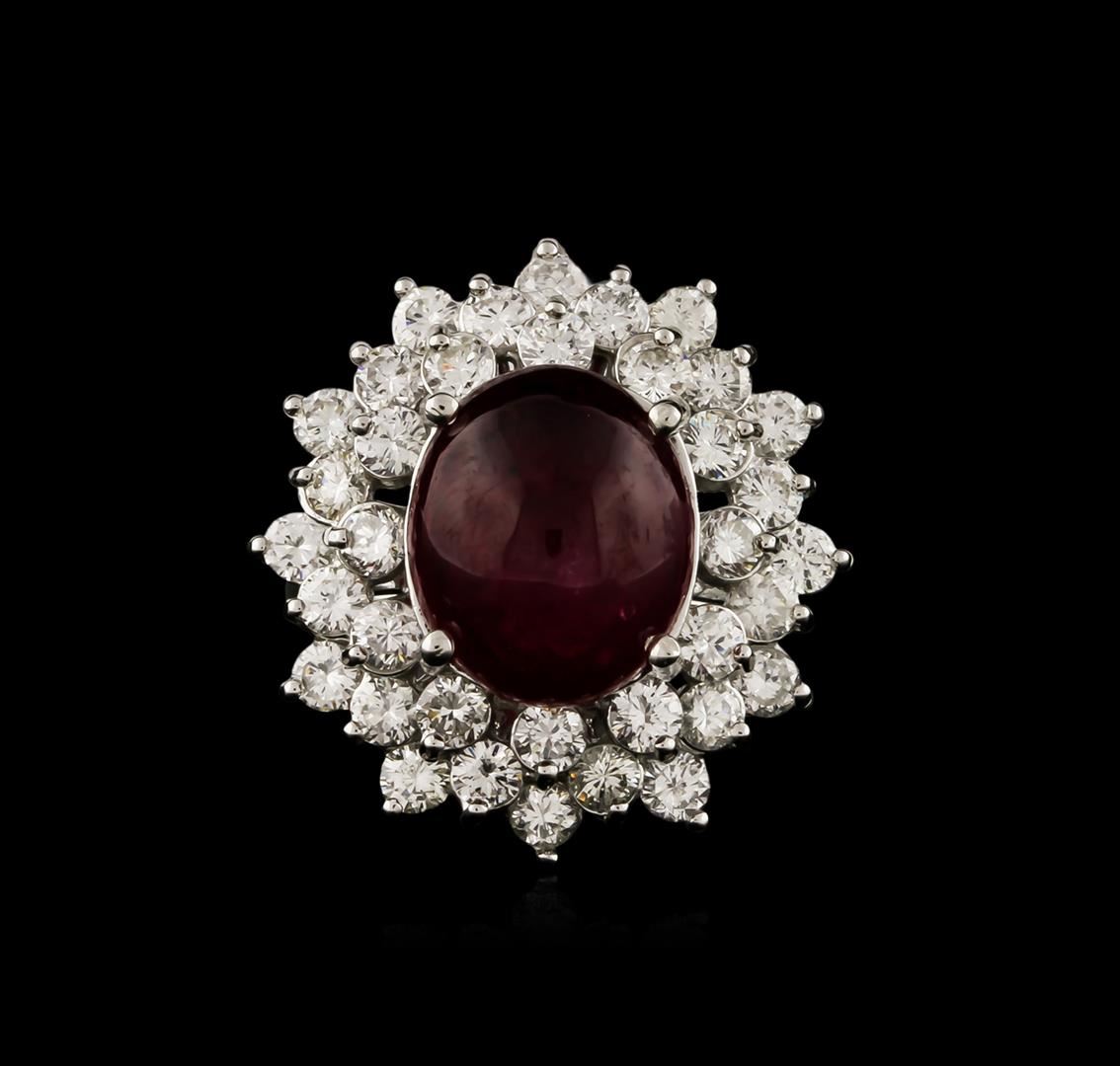 One electronically tested 14KT white gold ladies cast ruby and diamond ring with a bright polish finish. Identified with markings of "14K". Condition is new. Containing: One prong set oval cabochon cut natural ruby, measuring 12.70 x 10.60 x 5.90mm, approximate weight of 8.69ct., clarity is heavily included, medium, moderately strong, strongly purplish red color, (GIA stpR 5/4), cut is good. Thirty-Seven prong set round brilliant cut diamonds, measuring 2.80 - 2.80 x 1.68mm (depth est.) approximate total weight of 37 Stones = 2.97ct. Clarity: SI-1 to SI-2. Color: J - K, Cut is Good. Colored gemstones are presumed to have been subjected to commonly used enhancement processes, All diamonds and colored gemstones are graded in the mounting, unless otherwise stated. Total Weight of Colored Stones 8.69ct. Total Weight of Diamonds 2.97ct. Total Weight of Ring 11.30 grams. GGL Appraised at $7,690.00.