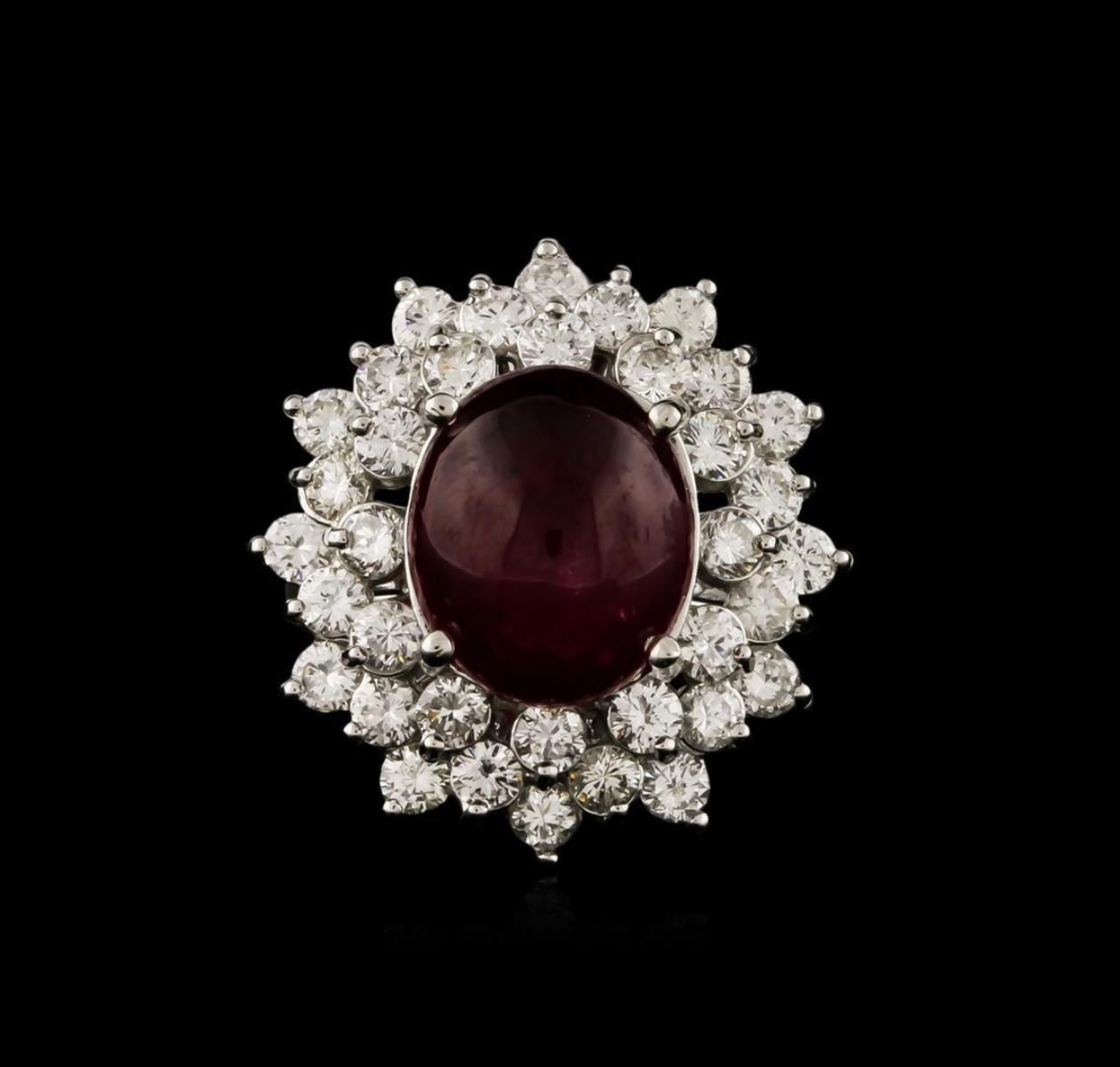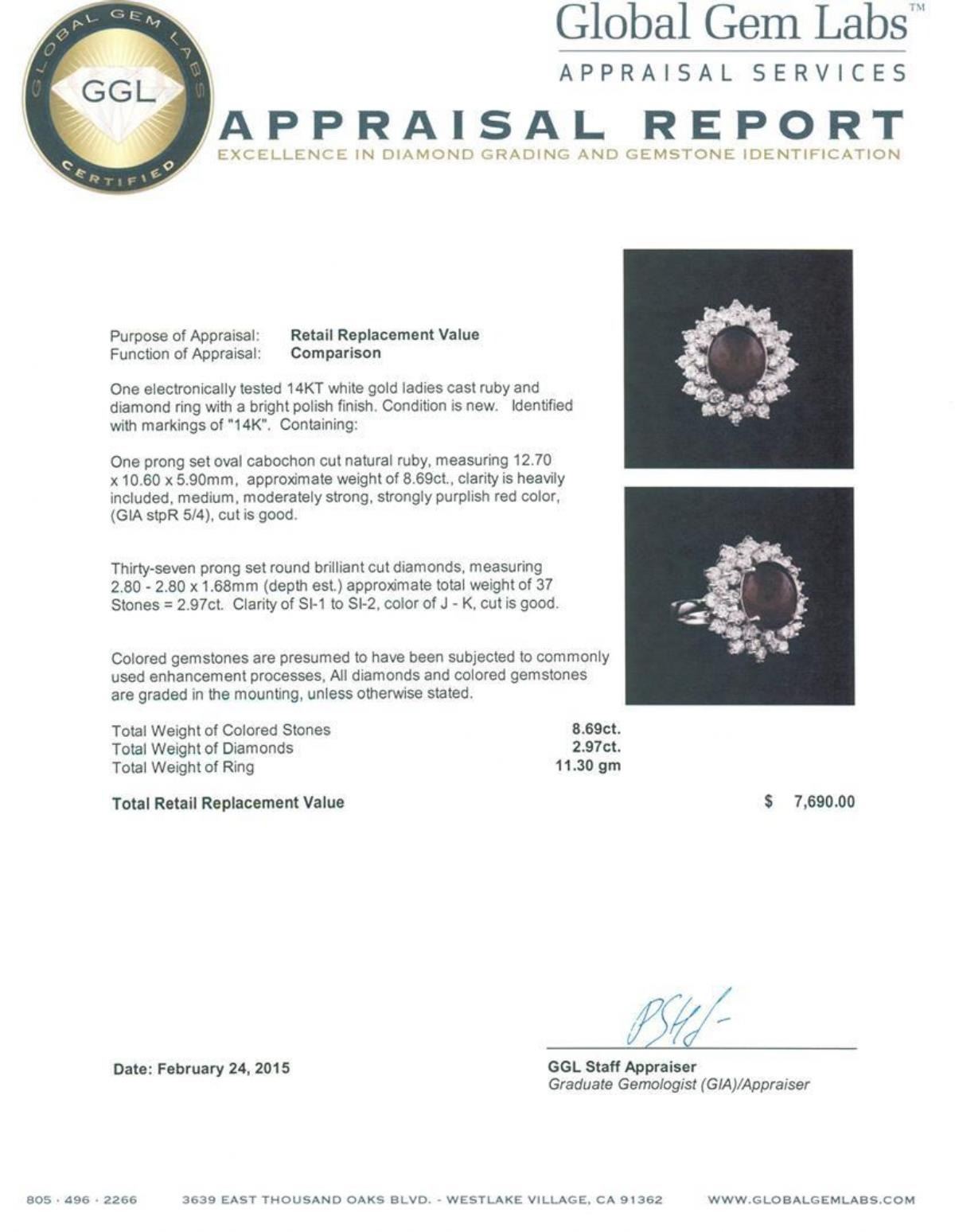 One electronically tested 14KT white gold ladies cast ruby and diamond ring with a bright polish finish. Identified with markings of "14K". Condition is new. Containing: One prong set oval cabochon cut natural ruby, measuring 12.70 x 10.60 x 5.90mm, approximate weight of 8.69ct., clarity is heavily included, medium, moderately strong, strongly purplish red color, (GIA stpR 5/4), cut is good. Thirty-Seven prong set round brilliant cut diamonds, measuring 2.80 - 2.80 x 1.68mm (depth est.) approximate total weight of 37 Stones = 2.97ct. Clarity: SI-1 to SI-2. Color: J - K, Cut is Good. Colored gemstones are presumed to have been subjected to commonly used enhancement processes, All diamonds and colored gemstones are graded in the mounting, unless otherwise stated. Total Weight of Colored Stones 8.69ct. Total Weight of Diamonds 2.97ct. Total Weight of Ring 11.30 grams. GGL Appraised.