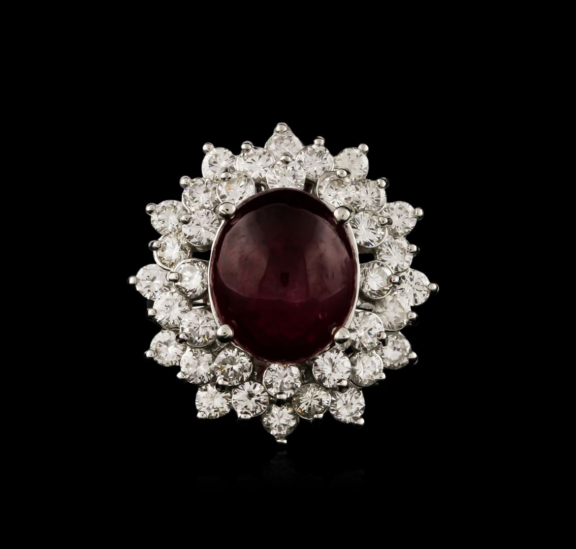 One electronically tested 14KT white gold ladies cast ruby and diamond ring with a bright polish finish. Identified with markings of "14K". Condition is new. Containing: One prong set oval cabochon cut natural ruby, measuring 12.70 x 10.60 x 5.90mm, approximate weight of 8.69ct., clarity is heavily included, medium, moderately strong, strongly purplish red color, (GIA stpR 5/4), cut is good. Thirty-Seven prong set round brilliant cut diamonds, measuring 2.80 - 2.80 x 1.68mm (depth est.) approximate total weight of 37 Stones = 2.97ct. Clarity: SI-1 to SI-2. Color: J - K, Cut is Good. Colored gemstones are presumed to have been subjected to commonly used enhancement processes, All diamonds and colored gemstones are graded in the mounting, unless otherwise stated. Total Weight of Colored Stones 8.69ct. Total Weight of Diamonds 2.97ct. Total Weight of Ring 11.30 grams. GGL Appraised at $7,690.00.