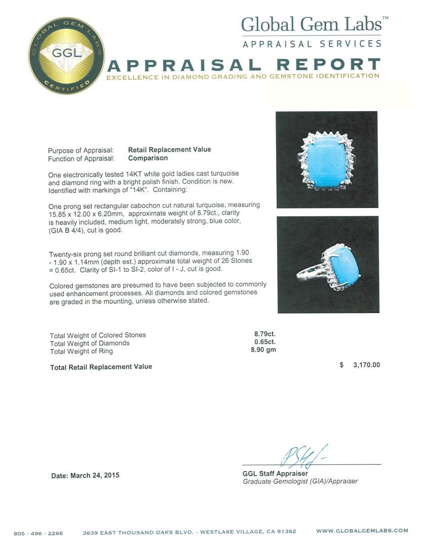 One electronically tested 14KT white gold ladies cast turquoise and diamond ring with a bright polish finish. Identified with markings of "14K". Condition is new. Containing: One prong set rectangular cabochon cut natural turquoise, measuring 15.85 x 12.00 x 6.20mm, approximate weight of 8.79ct., clarity is heavily included, medium light, moderately strong, blue color, (GIA B 4/4), cut is good. Twenty-Six prong set round brilliant cut diamonds, measuring 1.90 - 1.90 x 1.14mm (depth est.) approximate total weight of 26 Stones = 0.65ct. Clarity: SI-1 to SI-2. Color: I - J, Cut is Good. Colored gemstones are presumed to have been subjected to commonly used enhancement processes. All diamonds and colored gemstones are graded in the mounting, unless otherwise stated. Total Weight of Colored Stones 8.79ct. Total Weight of Diamonds 0.65ct. Total Weight of Ring 8.90 grams. GGL Appraised.