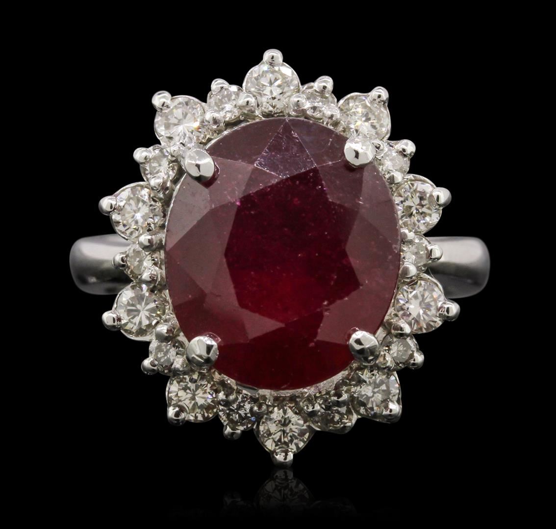One electronically tested 14KT white gold Ladies combination cast & assembled ring with a bright polish finish. Condition is new. Identified with markings of "K14". Containing: One prong set oval modified brilliant cut natural ruby, measuring 13.34 x 11.57 x 7.10mm, approximate weight of 8.81ct., clarity is heavily included, type II, medium dark, moderately strong, strongly purplish red color, (GIA stpR 6/4), cut is good. Colored gemstones are presumed to have been subjected to commonly used color/clarity enhancement processes. Ten prong set round brilliant cut diamonds, measuring 2.80 - 2.80 x 1.68mm (depth est.) approximate. Total Weight of 10 Stones = 0.80ct. Clarity: I-1 to I-2. Color: J - K, Cut is Good. Ten prong set round brilliant cut diamonds, measuring 1.50 - 1.50 x 0.90mm (depth est.) approximate. Total Weight of 10 Stones = 0.12ct. Clarity: I-1 to I-2. Color: J - K, Cut is Good. Total Weight of Colored Stones 8.81ct. Total Weight of Diamonds 0.93ct. Total Weight of Ring 7.80 grams. GGL Appraised at $5,465.00.