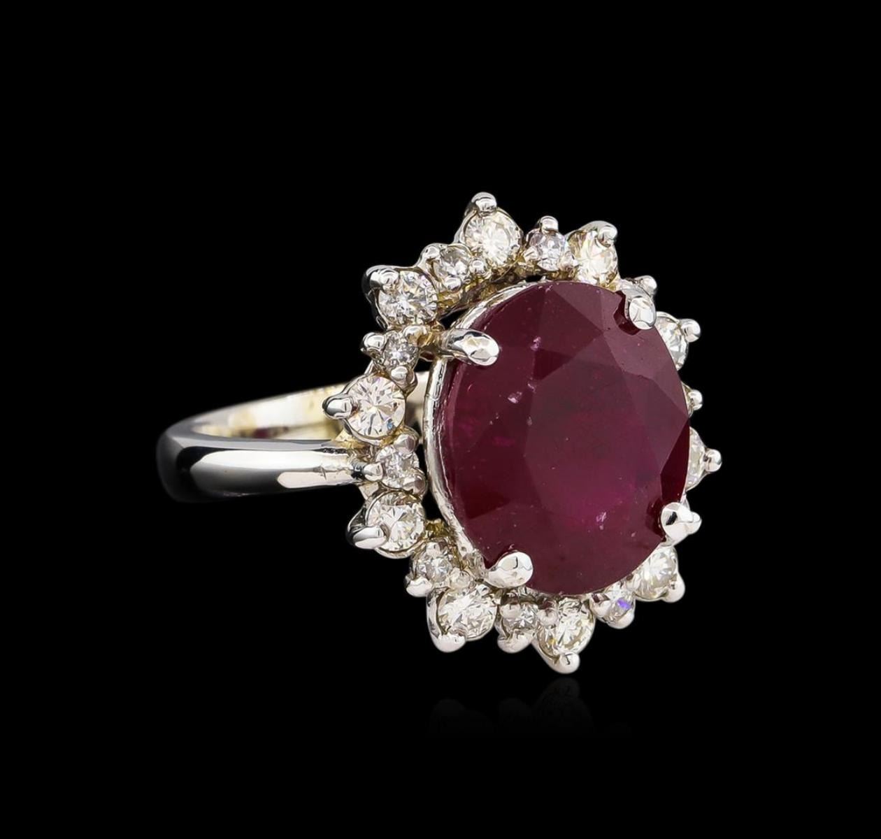 One electronically tested 14KT white gold Ladies combination cast & assembled ring with a bright polish finish. Condition is new. Identified with markings of "K14". Containing: One prong set oval modified brilliant cut natural ruby, measuring 13.34 x 11.57 x 7.10mm, approximate weight of 8.81ct., clarity is heavily included, type II, medium dark, moderately strong, strongly purplish red color, (GIA stpR 6/4), cut is good. Colored gemstones are presumed to have been subjected to commonly used color/clarity enhancement processes. Ten prong set round brilliant cut diamonds, measuring 2.80 - 2.80 x 1.68mm (depth est.) approximate. Total Weight of 10 Stones = 0.80 ct. Clarity: I-1 to I-2. Color: J - K, Cut is Good. Ten prong set round brilliant cut diamonds, measuring 1.50 - 1.50 x 0.90mm (depth est.) approximate. Total Weight of 10 Stones = 0.12ct. Clarity: I-1 to I-2. Color: J - K, Cut is Good. Total Weight of Colored Stones 8.81ct. Total Weight of Diamonds 0.93ct. Total Weight of Ring 7.80 grams. GGL Appraised.