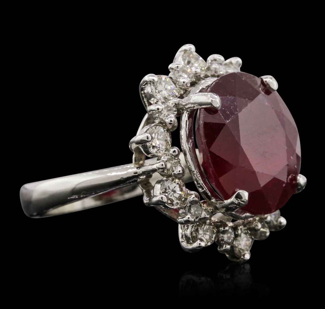 One electronically tested 14KT white gold Ladies combination cast & assembled ring with a bright polish finish. Condition is new. Identified with markings of "K14". Containing: One prong set oval modified brilliant cut natural ruby, measuring 13.34 x 11.57 x 7.10mm, approximate weight of 8.81ct., clarity is heavily included, type II, medium dark, moderately strong, strongly purplish red color, (GIA stpR 6/4), cut is good. Colored gemstones are presumed to have been subjected to commonly used color/clarity enhancement processes. Ten prong set round brilliant cut diamonds, measuring 2.80 - 2.80 x 1.68mm (depth est.) approximate. Total Weight of 10 Stones = 0.80ct. Clarity: I-1 to I-2. Color: J - K, Cut is Good. Ten prong set round brilliant cut diamonds, measuring 1.50 - 1.50 x 0.90mm (depth est.) approximate. Total Weight of 10 Stones = 0.12ct. Clarity: I-1 to I-2. Color: J - K, Cut is Good. Total Weight of Colored Stones 8.81ct. Total Weight of Diamonds 0.93ct. Total Weight of Ring 7.80 grams. GGL Appraised at $5,465.00.