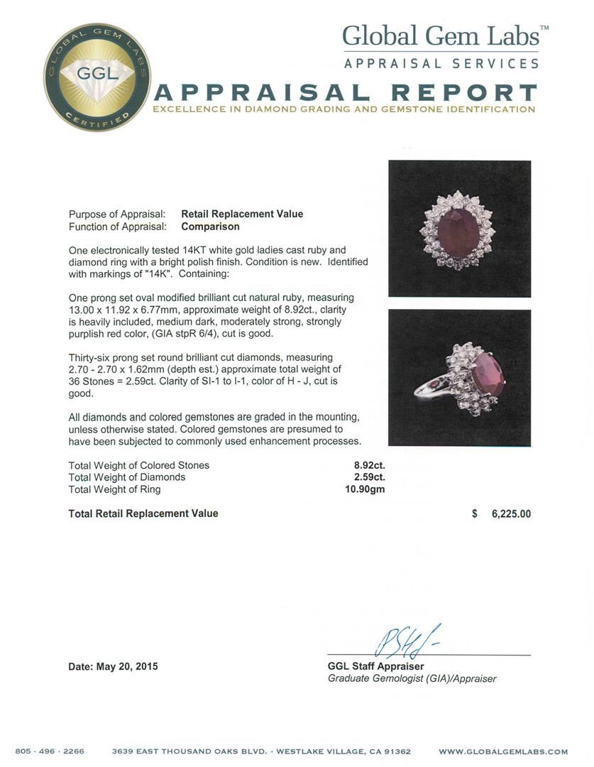 One electronically tested 14KT white gold ladies cast ruby and diamond ring with a bright polish finish. Identified with markings of "14K". Condition is new. Containing: One prong set oval modified brilliant cut natural ruby, measuring 13.00 x 11.92 x 6.77mm, approximate weight of 8.92ct., clarity is heavily included, medium dark, moderately strong, strongly purplish red color, (GIA stpR 6/4), cut is good. Thirty-Six prong set round brilliant cut diamonds, measuring 2.70 - 2.70 x 1.62mm (depth est.) approximate total weight of 36 Stones = 2.59ct. Clarity: SI-1 to I-1. Color: H - J, Cut is Good. All diamonds and colored gemstones are graded in the mounting, unless otherwise stated. Colored gemstones are presumed to have been subjected to commonly used enhancement processes. Total Weight of Colored Stones 8.92ct. Total Weight of Diamonds 2.59ct. Total Weight of Ring 10.90 grams. GGL Appraised.