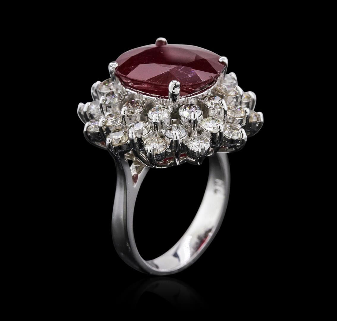 One electronically tested 14KT white gold ladies cast ruby and diamond ring with a bright polish finish. Identified with markings of "14K". Condition is new. Containing: One prong set oval modified brilliant cut natural ruby, measuring 13.00 x 11.92 x 6.77mm, approximate weight of 8.92ct., clarity is heavily included, medium dark, moderately strong, strongly purplish red color, (GIA stpR 6/4), cut is good. Thirty-Six prong set round brilliant cut diamonds, measuring 2.70 - 2.70 x 1.62mm (depth est.) approximate total weight of 36 Stones = 2.59ct. Clarity: SI-1 to I-1. Color: H - J, Cut is Good. All diamonds and colored gemstones are graded in the mounting, unless otherwise stated. Colored gemstones are presumed to have been subjected to commonly used enhancement processes. Total Weight of Colored Stones 8.92ct. Total Weight of Diamonds 2.59ct. Total Weight of Ring 10.90 grams. GGL Appraised.