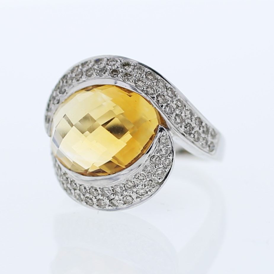 One 14KT White Gold 9.00ct Citrine and Diamond Ring. (1) Citrine stone with a total weight of 9.00cts. (72) Diamonds with a total weight of 0.94cts. Total weight of this ring is 7.31 grams.