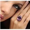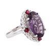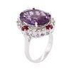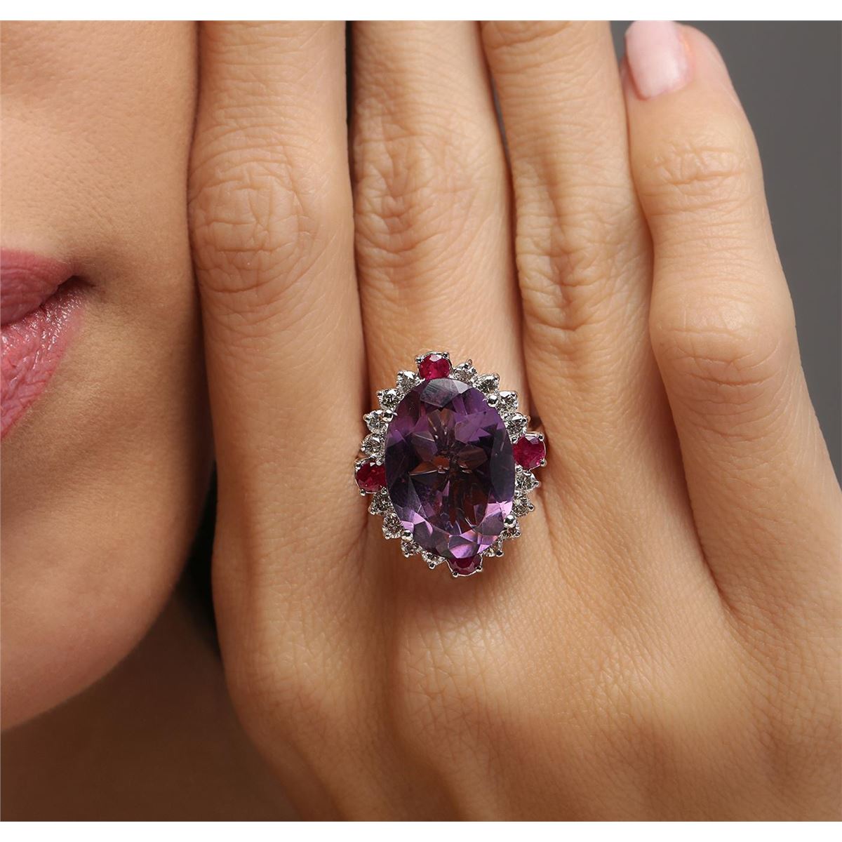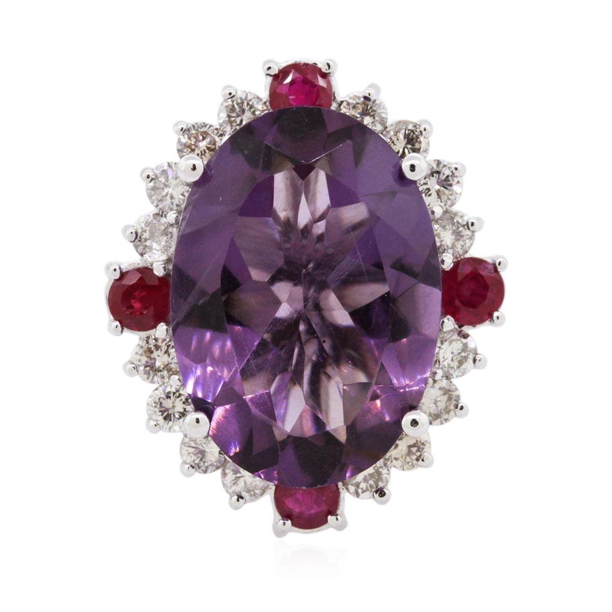 One electronically tested 14KT white gold ladies cast amethyst, ruby and diamond ring with a bright polish finish. The featured amethyst is set within a ruby and diamond bezel, completed by a two and one-half millimeter wide band. Identified with markings of "K14". Condition is new, good workmanship. Containing: One prong set oval mixed cut natural amethyst, measuring 17.90 x 12.00 x 7.15mm, 6% bulge factor, approximate weight of 9.01ct., clarity is slightly included, type II, medium dark, very slightly grayish, purple color, (GIA P 6/3), cut is good. Transmitting light with a minimum of distortion, transparent. Naturally occurring internal & external characteristics are present. Colored Stone Grading Report attached. Graded in the setting. Four prong set round mixed cut natural rubies, measuring 3.20 - 3.20 x 2.08 mm, approximate total weight of 0.68ct., clarity is moderately included, type II, medium dark, moderately strong, slightly purplish red color, (GIA slpR 6/4), cut is good. Transmitting light with a minimum of distortion, transparent. Naturally occurring internal & external characteristics are present. Color grade is an average for the group. Graded in the setting. Sixteen prong set round brilliant cut diamonds, measuring 2.40 - 2.30 x 1.41mm (depth est.) approximate total weight of 16 Stones = 0.86ct. Graded in the setting. Clarity: I-1 to I-2. Color: I - K. Total Weight of Colored Stones 9.69ct. Total Weight of Diamonds 0.86ct. Total Weight of Ring 8.80 grams. AIG Appraised at $3,660.00.