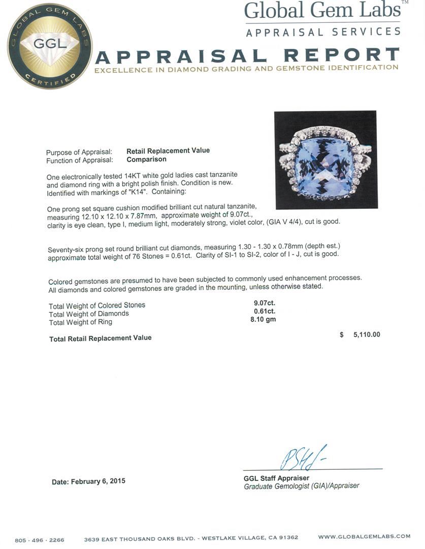 One electronically tested 14KT white gold ladies cast tanzanite and diamond ring with a bright polish finish. Identified with markings of "K14". Condition is new. Containing: One prong set square cushion modified brilliant cut natural tanzanite, measuring 12.10 x 12.10 x 7.87mm, approximate weight of 9.07ct., clarity is eye clean, type I, medium light, moderately strong, violet color, (GIA V 4/4), cut is good. Seventy-Six prong set round brilliant cut diamonds, measuring 1.30 - 1.30 x 0.78mm (depth est.) approximate. Total Weight of 76 Stones = 0.61ct. Clarity: SI-1 to SI-2. Color: I - J, Cut is Good. Colored gemstones are presumed to have been subjected to commonly used enhancement processes. All diamonds and colored gemstones are graded in the mounting, unless otherwise stated. Total Weight of Colored Stones 9.07ct. Total Weight of Diamonds 0.61ct. Total Weight of Ring 8.10 grams. GGL Appraised.