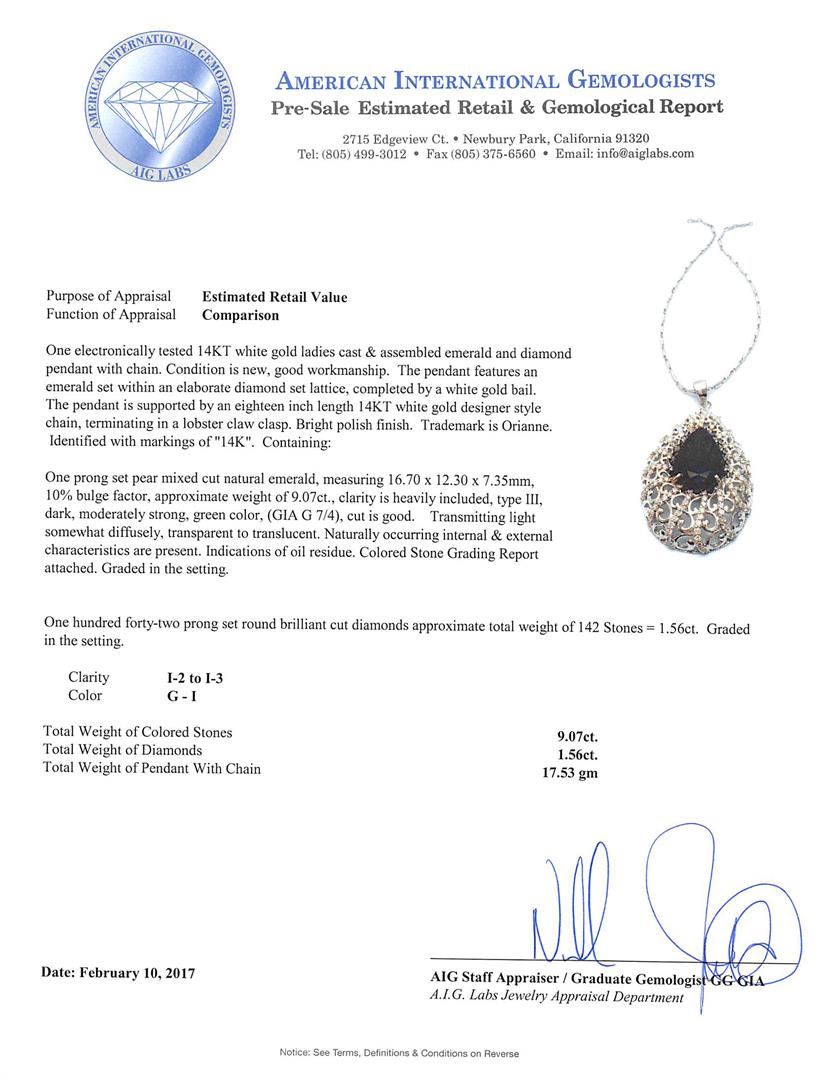 One electronically tested 14KT white gold ladies cast & assembled emerald and diamond pendant with chain. The pendant features an emerald set within an elaborate diamond set lattice, completed by a white gold bail. The pendant is supported by an eighteen inch length 14KT white gold designer style chain, terminating in a lobster claw clasp. Bright polish finish. Trademark is Orianne. Identified with markings of "14K". Condition is new, good workmanship. Containing: One prong set pear mixed cut natural emerald, measuring 16.70 x 12.30 x 7.35mm, 10%. bulge factor, approximate weight of 9.07ct., clarity is heavily included, type III, dark, moderately strong, green color, (GIA G 7/4), cut is good. Transmitting light somewhat diffusely, transparent to translucent. Naturally occurring internal & external characteristics are present. Indications of oil residue. Colored Stone Grading Report attached. Graded in the setting. One Hundred Forty-Two prong set round brilliant cut diamonds approximate total weight of 142 Stones = 1.56ct. Graded in the setting. Clarity: I-2 to I-3. Color: G - I. Total Weight of Colored Stones 9.07ct. Total Weight of Diamonds 1.56ct. Total Weight of Pendant With Chain 17.53gm. AIG Appraised.
