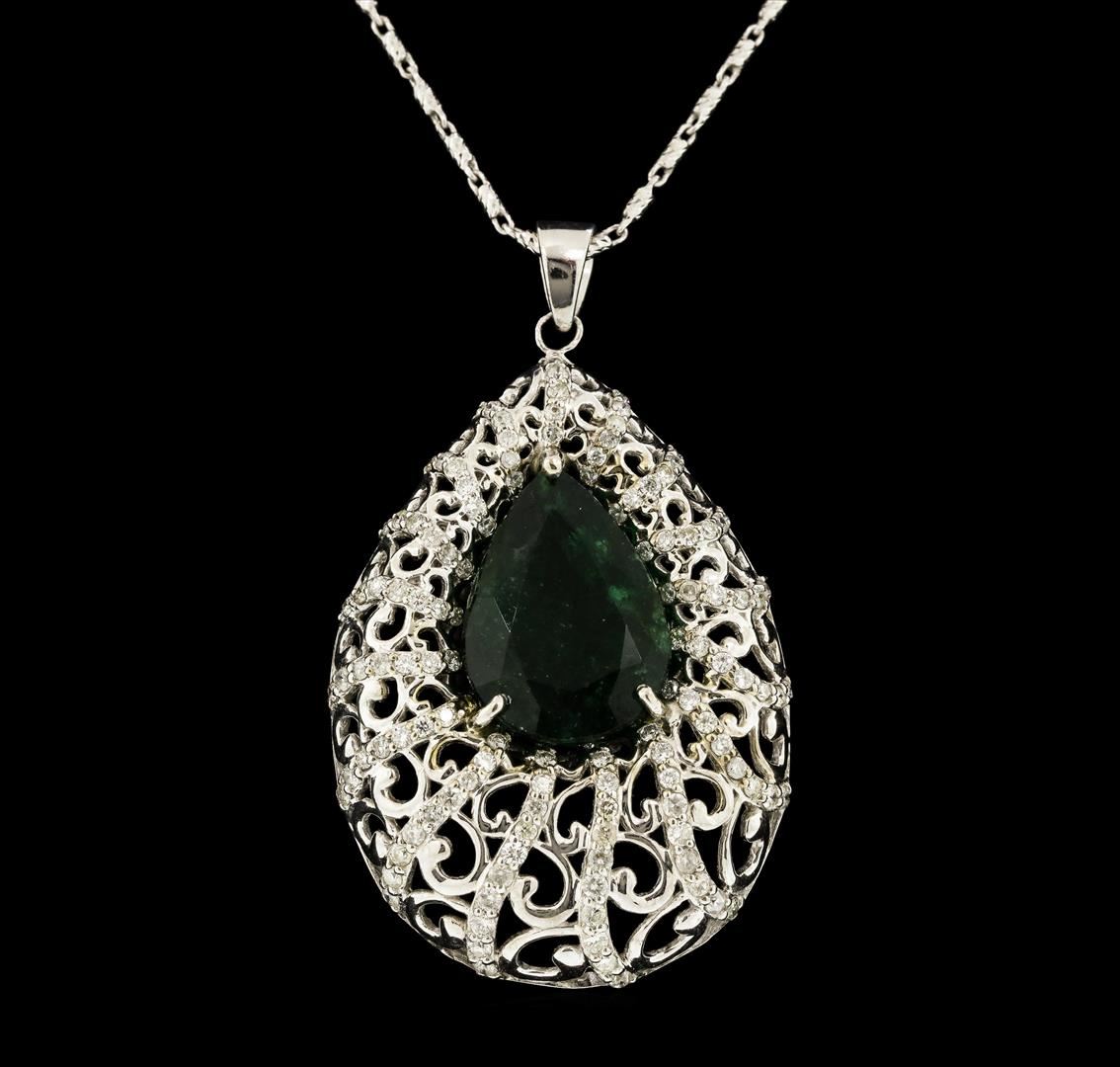 One electronically tested 14KT white gold ladies cast & assembled emerald and diamond pendant with chain. The pendant features an emerald set within an elaborate diamond set lattice, completed by a white gold bail. The pendant is supported by an eighteen inch length 14KT white gold designer style chain, terminating in a lobster claw clasp. Bright polish finish. Trademark is Orianne. Identified with markings of "14K". Condition is new, good workmanship. Containing: One prong set pear mixed cut natural emerald, measuring 16.70 x 12.30 x 7.35mm, 10%. bulge factor, approximate weight of 9.07ct., clarity is heavily included, type III, dark, moderately strong, green color, (GIA G 7/4), cut is good. Transmitting light somewhat diffusely, transparent to translucent. Naturally occurring internal & external characteristics are present. Indications of oil residue. Colored Stone Grading Report attached. Graded in the setting. One Hundred Forty-Two prong set round brilliant cut diamonds approximate total weight of 142 Stones = 1.56ct. Graded in the setting. Clarity: I-2 to I-3. Color: G - I. Total Weight of Colored Stones 9.07ct. Total Weight of Diamonds 1.56ct. Total Weight of Pendant With Chain 17.53gm. AIG Appraised.
