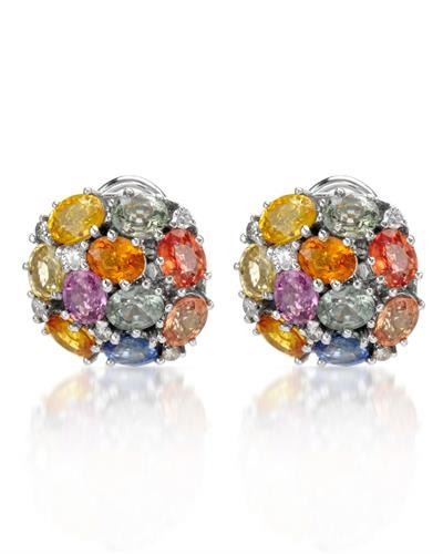 14KT White Gold 9.10ctw Multi Color Sapphire and Diamond Earrings. (20) Multi color sapphires with a total weight of 9.10cts. (12) Round Diamonds with a total weight of 0.33cts with a color of I and clarity of I-1. Total weight of these earrings are 8.59 grams.