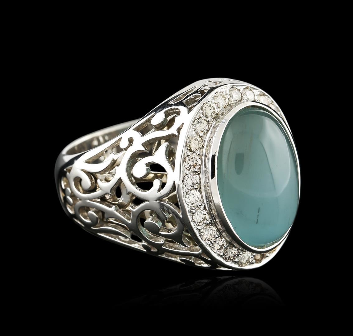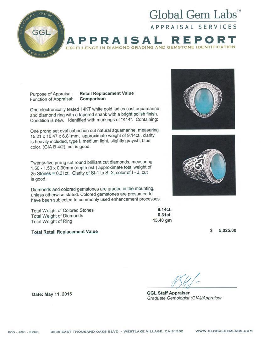 One electronically tested 14KT white gold ladies cast aquamarine and diamond ring with a tapered shank with a bright polish finish. Identified with markings of "K14". Condition is new. Containing: One prong set oval cabochon cut natural aquamarine, measuring 15.21 x 10.47 x 6.81mm, approximate weight of 9.14ct., clarity is heavily included, type I, medium light, slightly grayish, blue color, (GIA B 4/2), cut is good. Twenty-Five prong set round brilliant cut diamonds, measuring 1.50 - 1.50 x 0.90mm (depth est.) approximate total weight of 25 Stones = 0.31ct. Clarity: SI-1 to SI-2. Color: I - J, Cut is Good. Diamonds and colored gemstones are graded in the mounting, unless otherwise stated. Colored gemstones are presumed to have been subjected to commonly used enhancement processes. Total Weight of Colored Stones 9.14ct. Total Weight of Diamonds 0.31ct. Total Weight of Ring 15.40 grams. GGL Appraised.