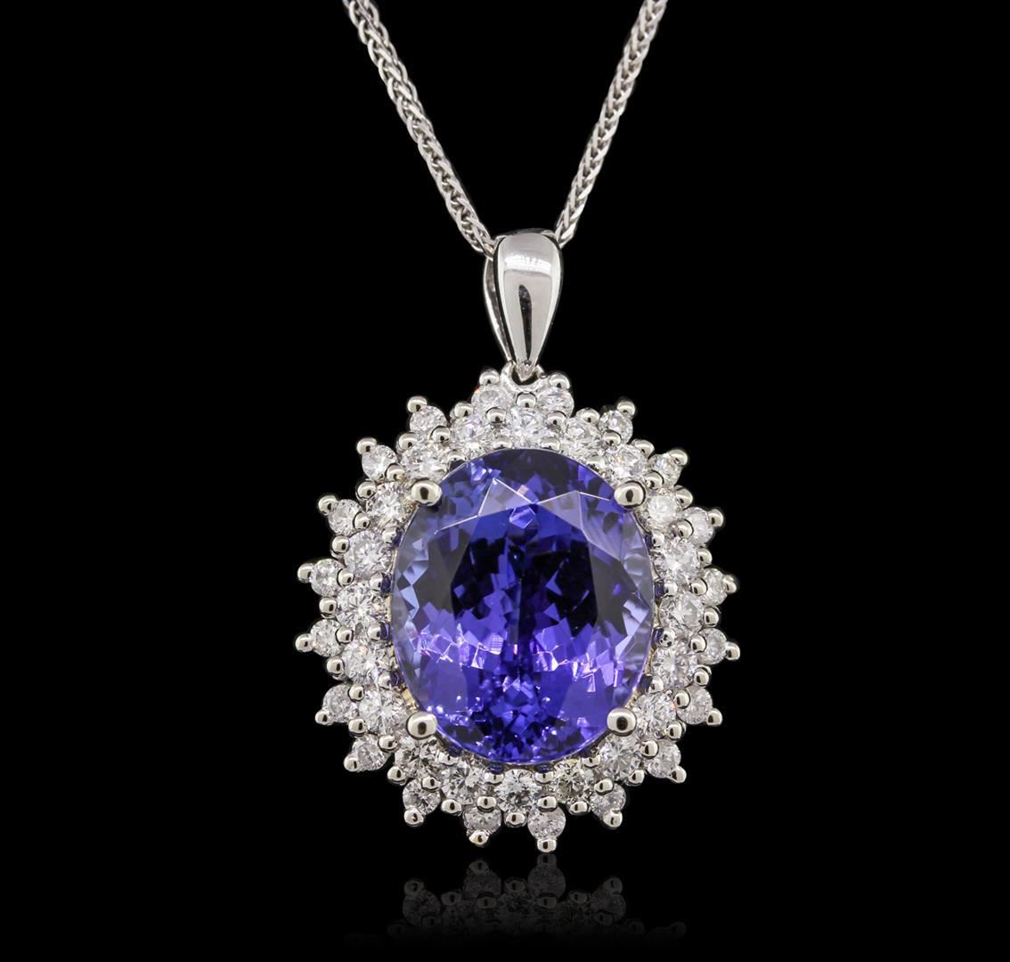 One electronically tested 14KT white gold ladies cast & assembled tanzanite and diamond pendant with chain. Condition is new, good workmanship. The pendant features a tanzanite set within a tiered diamond bezel, completed by a white gold bail. The pendant is supported by an eighteen inch length 14KT white gold designer style chain, terminating in a lobster claw clasp. Bright polish finish. Identified with markings of "14K". Containing: One prong set oval brilliant cut natural tanzanite, measuring 13.80 x 11.50 x 7.89mm, 8% bulge factor, approximate weight of 9.14ct., clarity is eye clean, type I, dark, very slightly grayish, violetish blue color, (GIA vB 7/3), cut is good. Transmitting light with no distortion, transparent. Colored Stone Grading Report attached. Graded in the setting. Tanzanite is a very rare gemstone that is only found in the country of Tanzania. Originally discovered in 1967. Tiffany & Company, named the stone Tanzanite. It is found in the Usumburu Mountains that border the Umba Valley of northern Tanzania. Tanzanite occurs in gray, brown, violet, blue, reddish-purple, & green. The gem is interesting because of its exceptional pleochroism. Rotated in different directions a tanzanite will exhibit multiple changes of color. Tanzanite has a low tolerance to ultrasonic cleaning, and should not be cleaned using this method. Twenty prong set round brilliant cut diamonds, measuring 2.10 - 2.00 x 1.23mm (depth est.) approximate total weight of 20 Stones = 0.73ct. Graded in the setting. Clarity SI-1 to I-1 Color H - J Twenty prong set round brilliant cut diamonds, measuring 1.60 - 1.50 x 0.93mm (depth est.) approximate total weight of 20 Stones = 0.37ct. Graded in the setting. Clarity SI-1 to I-1 Color H - J Total Weight of Colored Stones 9.14ct. Total Weight of Diamonds 1.10 ct. Total Weight of Pendant With Chain 8.30 grams. AIG appraised at $27,225.00. AIG Appraised.