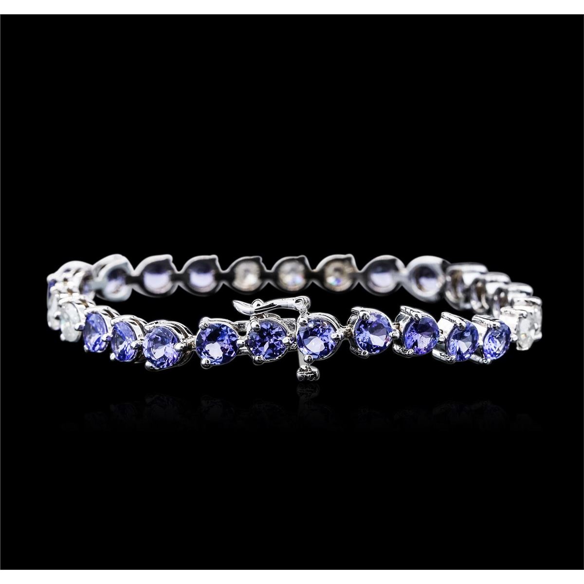 One electronically tested 14KT white gold ladies combination cast & assembled tanzanite and diamond bracelet with a hidden box clasp with safety closer with a bright polish finish. Bracelet measures 7" long. Identified with markings of "14K". Condition is new. Containing: Twenty prong set round modified brilliant cut natural tanzanites, measuring 4.96 - 4.79 x 2.80 mm, approximate total weight of 9.20ct., clarity is eye clean, type I, medium light, very slightly grayish, violet color, (GIA V 4/3), cut is good. Seven prong set round brilliant cut diamonds, measuring 5.17 - 5.11 x 3.08mm (depth est.) approximate total weight of 7 Stones = 3.47ct. Clarity: I-2 to I-3. Color: I - J, Cut is Good. All diamonds and colored gemstones are graded in the mounting, unless otherwise stated. Colored gemstones are presumed to have been subjected to commonly used enhancement processes. Total Weight of Colored Stones 9.20ct. Total Weight of Diamonds 3.47ct. Total Weight of Bracelet 17.00 grams. GGL Appraised at $8,635.00.