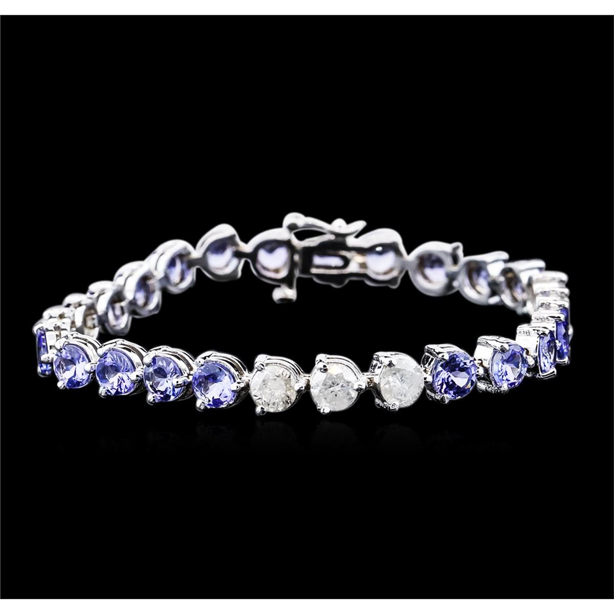 One electronically tested 14KT white gold ladies combination cast & assembled tanzanite and diamond bracelet with a hidden box clasp with safety closer with a bright polish finish. Bracelet measures 7" long. Identified with markings of "14K". Condition is new. Containing: Twenty prong set round modified brilliant cut natural tanzanites, measuring 4.96 - 4.79 x 2.80 mm, approximate total weight of 9.20ct., clarity is eye clean, type I, medium light, very slightly grayish, violet color, (GIA V 4/3), cut is good. Seven prong set round brilliant cut diamonds, measuring 5.17 - 5.11 x 3.08mm (depth est.) approximate total weight of 7 Stones = 3.47ct. Clarity: I-2 to I-3. Color: I - J, Cut is Good. All diamonds and colored gemstones are graded in the mounting, unless otherwise stated. Colored gemstones are presumed to have been subjected to commonly used enhancement processes. Total Weight of Colored Stones 9.20ct. Total Weight of Diamonds 3.47ct. Total Weight of Bracelet 17.00 grams. GGL Appraised at $8,635.00.