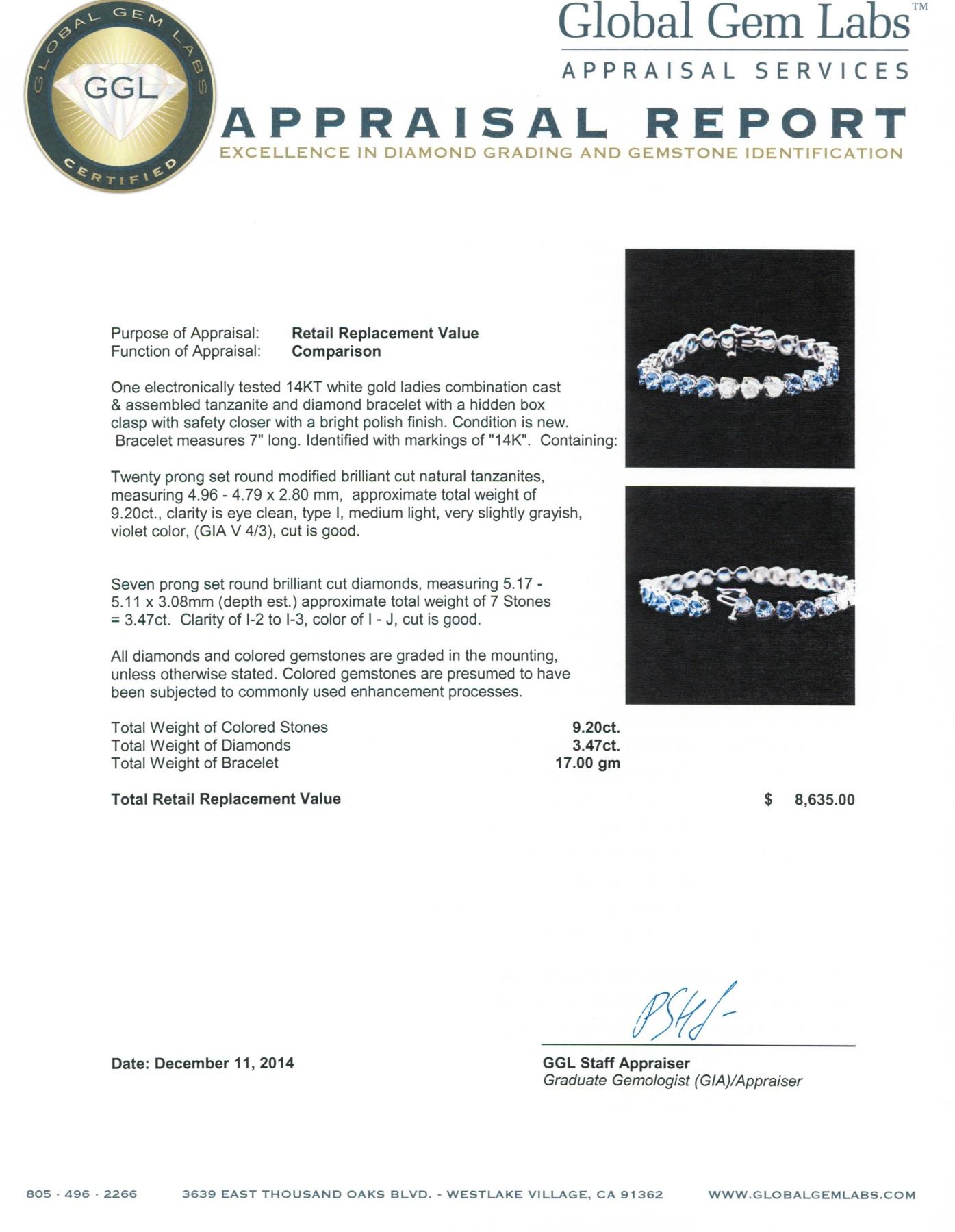One electronically tested 14KT white gold ladies combination cast & assembled tanzanite and diamond bracelet with a hidden box clasp with safety closer with a bright polish finish. Bracelet measures 7" long. Identified with markings of "14K". Condition is new. Containing: Twenty prong set round modified brilliant cut natural tanzanites, measuring 4.96 - 4.79 x 2.80 mm, approximate total weight of 9.20ct., clarity is eye clean, type I, medium light, very slightly grayish, violet color, (GIA V 4/3), cut is good. Seven prong set round brilliant cut diamonds, measuring 5.17 - 5.11 x 3.08mm (depth est.) approximate total weight of 7 Stones = 3.47ct. Clarity: I-2 to I-3. Color: I - J, Cut is Good. All diamonds and colored gemstones are graded in the mounting, unless otherwise stated. Colored gemstones are presumed to have been subjected to commonly used enhancement processes. Total Weight of Colored Stones 9.20ct. Total Weight of Diamonds 3.47ct. Total Weight of Bracelet 17.00 grams. GGL Appraised at $8,635.00.