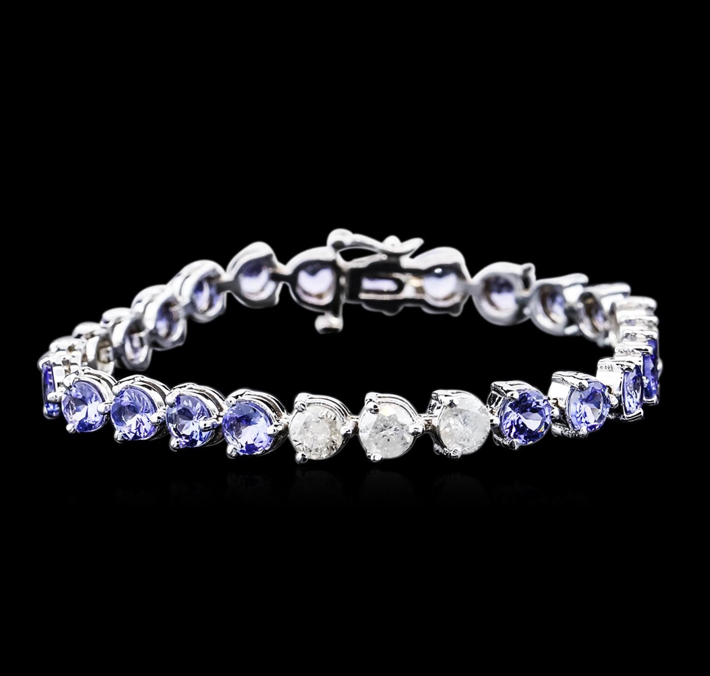 One electronically tested 14KT white gold ladies combination cast & assembled tanzanite and diamond bracelet with a hidden box clasp with safety closer with a bright polish finish. Bracelet measures 7" long. Identified with markings of "14K". Condition is new. Containing: Twenty prong set round modified brilliant cut natural tanzanites, measuring 4.96 - 4.79 x 2.80 mm, approximate total weight of 9.20ct., clarity is eye clean, type I, medium light, very slightly grayish, violet color, (GIA V 4/3), cut is good. Seven prong set round brilliant cut diamonds, measuring 5.17 - 5.11 x 3.08mm (depth est.) approximate total weight of 7 Stones = 3.47ct. Clarity: I-2 to I-3. Color: I - J, Cut is Good. All diamonds and colored gemstones are graded in the mounting, unless otherwise stated. Colored gemstones are presumed to have been subjected to commonly used enhancement processes. Total Weight of Colored Stones 9.20ct. Total Weight of Diamonds 3.47ct. Total Weight of Bracelet 17.00 grams. GGL Appraised.