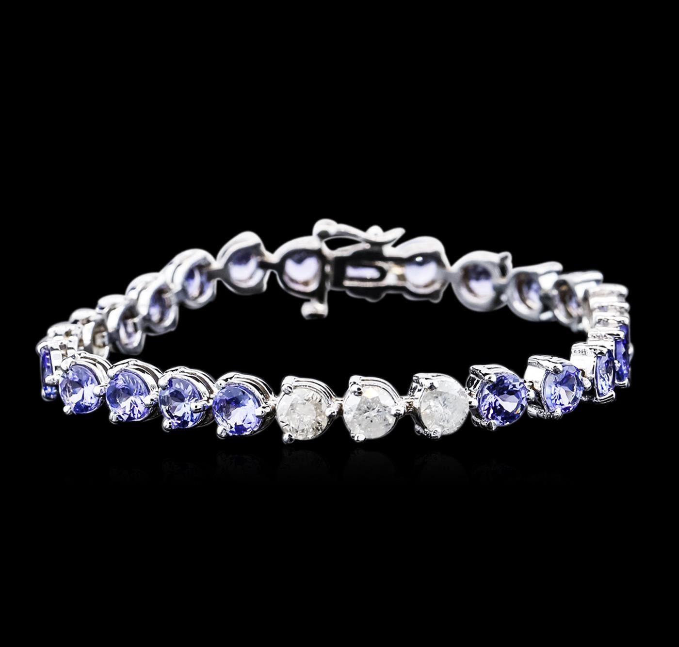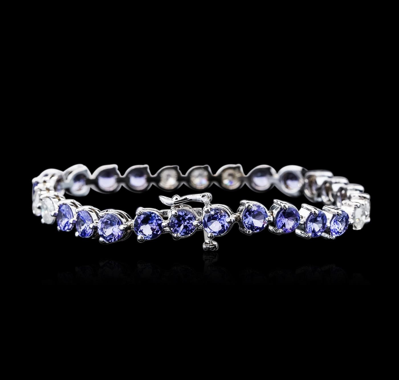 One electronically tested 14KT white gold ladies combination cast & assembled tanzanite and diamond bracelet with a hidden box clasp with safety closer with a bright polish finish. Bracelet measures 7" long. Identified with markings of "14K". Condition is new. Containing: Twenty prong set round modified brilliant cut natural tanzanites, measuring 4.96 - 4.79 x 2.80 mm, approximate total weight of 9.20 ct., clarity is eye clean, type I, medium light, very slightly grayish, violet color, (GIA V 4/3), cut is good. Seven prong set round brilliant cut diamonds, measuring 5.17 - 5.11 x 3.08mm (depth est.) approximate total weight of 7 Stones = 3.47ct. Clarity: I-2 to I-3. Color: I - J, Cut is Good. All diamonds and colored gemstones are graded in the mounting, unless otherwise stated. Colored gemstones are presumed to have been subjected to commonly used enhancement processes. Total Weight of Colored Stones 9.20 ct. Total Weight of Diamonds 3.47ct. Total Weight of Bracelet 17.00 grams. GGL Appraised.