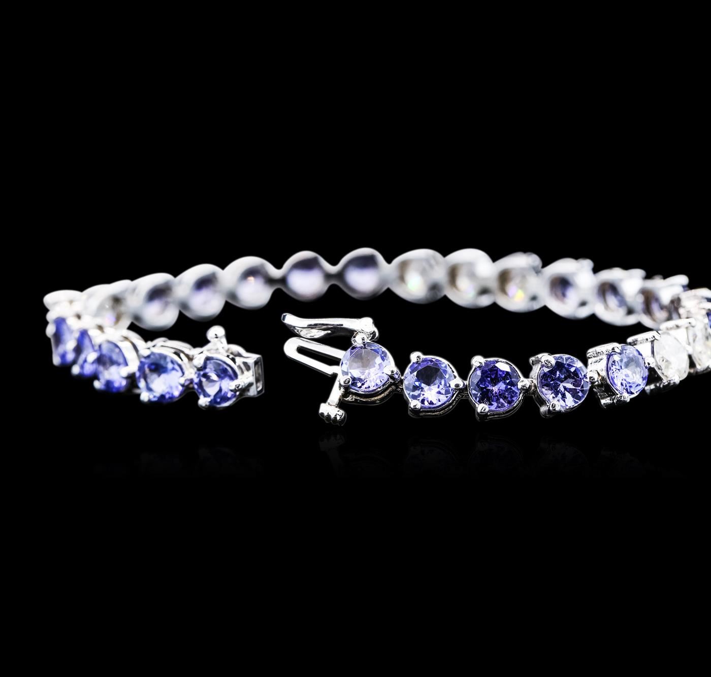 One electronically tested 14KT white gold ladies combination cast & assembled tanzanite and diamond bracelet with a hidden box clasp with safety closer with a bright polish finish. Bracelet measures 7" long. Identified with markings of "14K". Condition is new. Containing: Twenty prong set round modified brilliant cut natural tanzanites, measuring 4.96 - 4.79 x 2.80 mm, approximate total weight of 9.20 ct., clarity is eye clean, type I, medium light, very slightly grayish, violet color, (GIA V 4/3), cut is good. Seven prong set round brilliant cut diamonds, measuring 5.17 - 5.11 x 3.08mm (depth est.) approximate total weight of 7 Stones = 3.47ct. Clarity: I-2 to I-3. Color: I - J, Cut is Good. All diamonds and colored gemstones are graded in the mounting, unless otherwise stated. Colored gemstones are presumed to have been subjected to commonly used enhancement processes. Total Weight of Colored Stones 9.20 ct. Total Weight of Diamonds 3.47ct. Total Weight of Bracelet 17.00 grams. GGL Appraised.