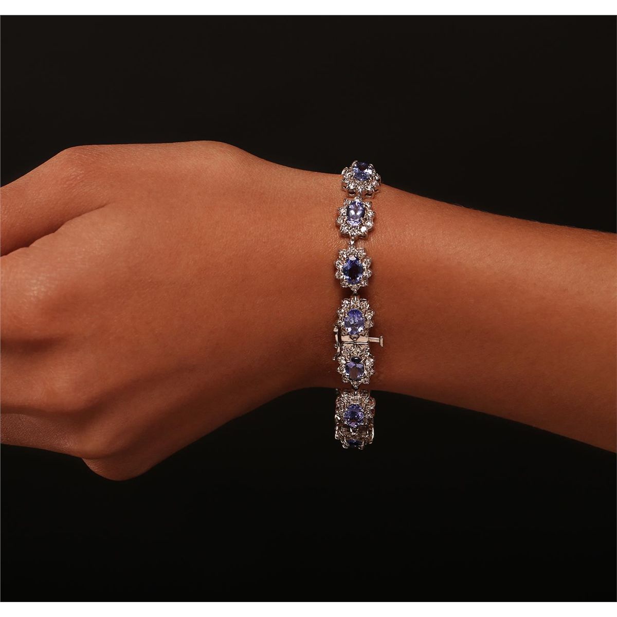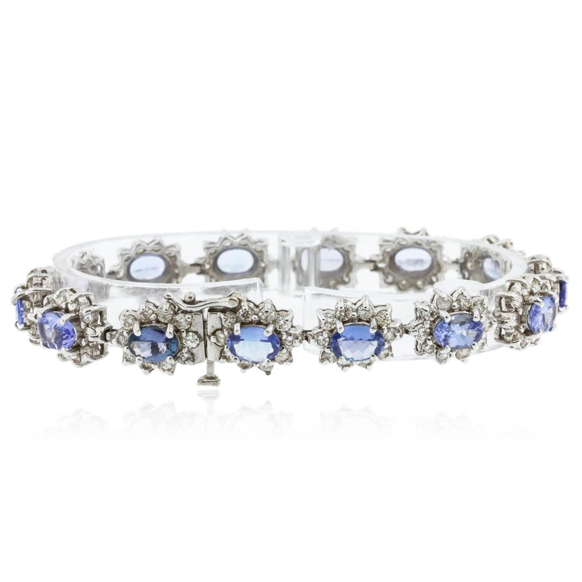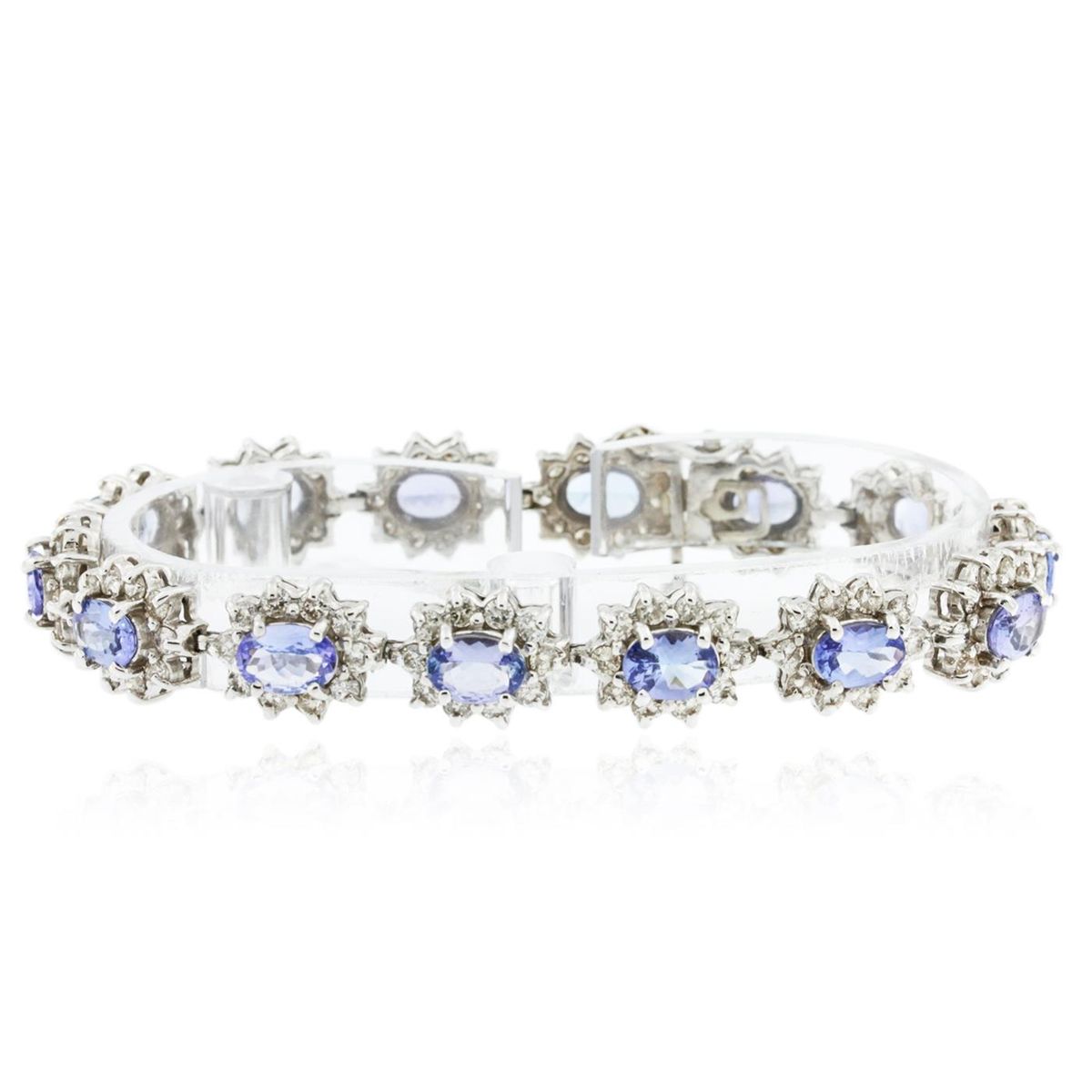 One electronically tested 14KT white gold ladies cast & assembled tanzanite and diamond bracelet. Condition is new, good workmanship. Seven and one-quarter inch length bracelet features a flexible tanzanite and diamond floret ribbon, terminating in a concealed clasp with safety. Bright polish finish. Identified with markings of "14K". Containing: Fourteen prong set oval mixed cut natural tanzanites, measuring 7.00 x 5.00 x 2.70mm, approximate. Total Weight of 9.20ct., clarity is eye clean, type I, medium dark, very slightly grayish, bluish violet color, (GIA bV 6/3), cut is good. Transmitting light with no distortion, transparent. Measurements & the color grade are an average for the group. Graded in the setting. Tanzanite is a very rare gemstone that is only found in the country of Tanzania. Originally discovered in 1967. Tiffany & Company, named the stone Tanzanite. It is found in the Usumburu Mountains that border the Umba Valley of northern Tanzania. Tanzanite occurs in gray, brown, violet, blue, reddish-purple, & green. The gem is interesting because of its exceptional pleochroism. Rotated in different directions a tanzanite will exhibit multiple changes of color. Tanzanite has a low tolerance to ultrasonic cleaning, and should not be cleaned using this method. One Hundred Forty prong set round brilliant cut diamonds, measuring 2.10 - 2.00 x 1.23mm (depth est.) approximate. Total Weight of 140 Stones = 4.51ct. Graded in the setting. Clarity: SI-1 to I-1. Color: H - J. Total Weight of Colored Stones 9.20ct. Total Weight of Diamonds 4.51ct. Total Weight of Bracelet 23.58 grams. AIG Appraised at $23,115.00.