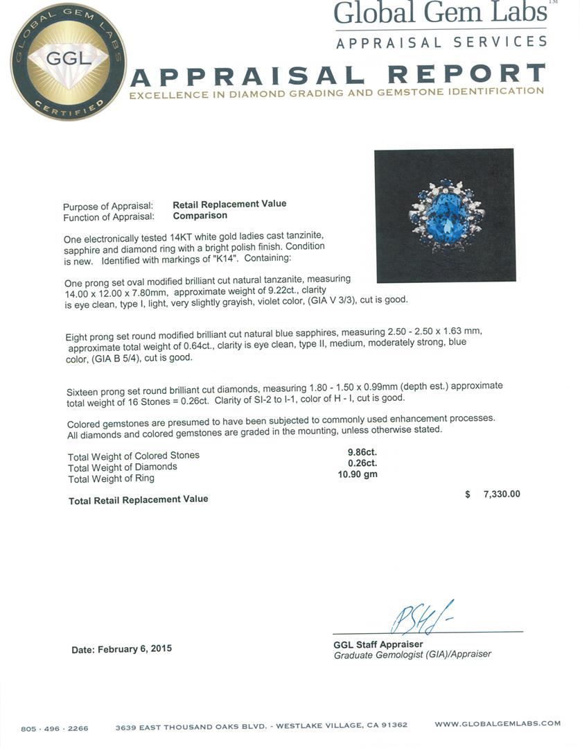 One electronically tested 14KT white gold ladies cast tanzanite, sapphire and diamond ring with a bright polish finish. Identified with markings of "K14". Condition is new. Containing: One prong set oval modified brilliant cut natural tanzanite, measuring 14.00 x 12.00 x 7.80mm, approximate weight of 9.22ct., clarity is eye clean, type I, light, very slightly grayish, violet color, (GIA V 3/3), cut is good. Eight prong set round modified brilliant cut natural blue sapphires, measuring 2.50 - 2.50 x 1.63 mm, approximate total weight of 0.64ct., clarity is eye clean, type II, medium, moderately strong, blue color, (GIA B 5/4), cut is good. Sixteen prong set round brilliant cut diamonds, measuring 1.80 - 1.50 x 0.99mm (depth est.) approximate total weight of 16 Stones = 0.26ct. Clarity: SI-2 to I-1. Color: H - I, Cut is Good. Colored gemstones are presumed to have been subjected to commonly used enhancement processes. All diamonds and colored gemstones are graded in the mounting, unless otherwise stated. Total Weight of Colored Stones 9.86ct. Total Weight of Diamonds 0.26ct. Total Weight of Ring 10.90 grams. GGL Appraised.