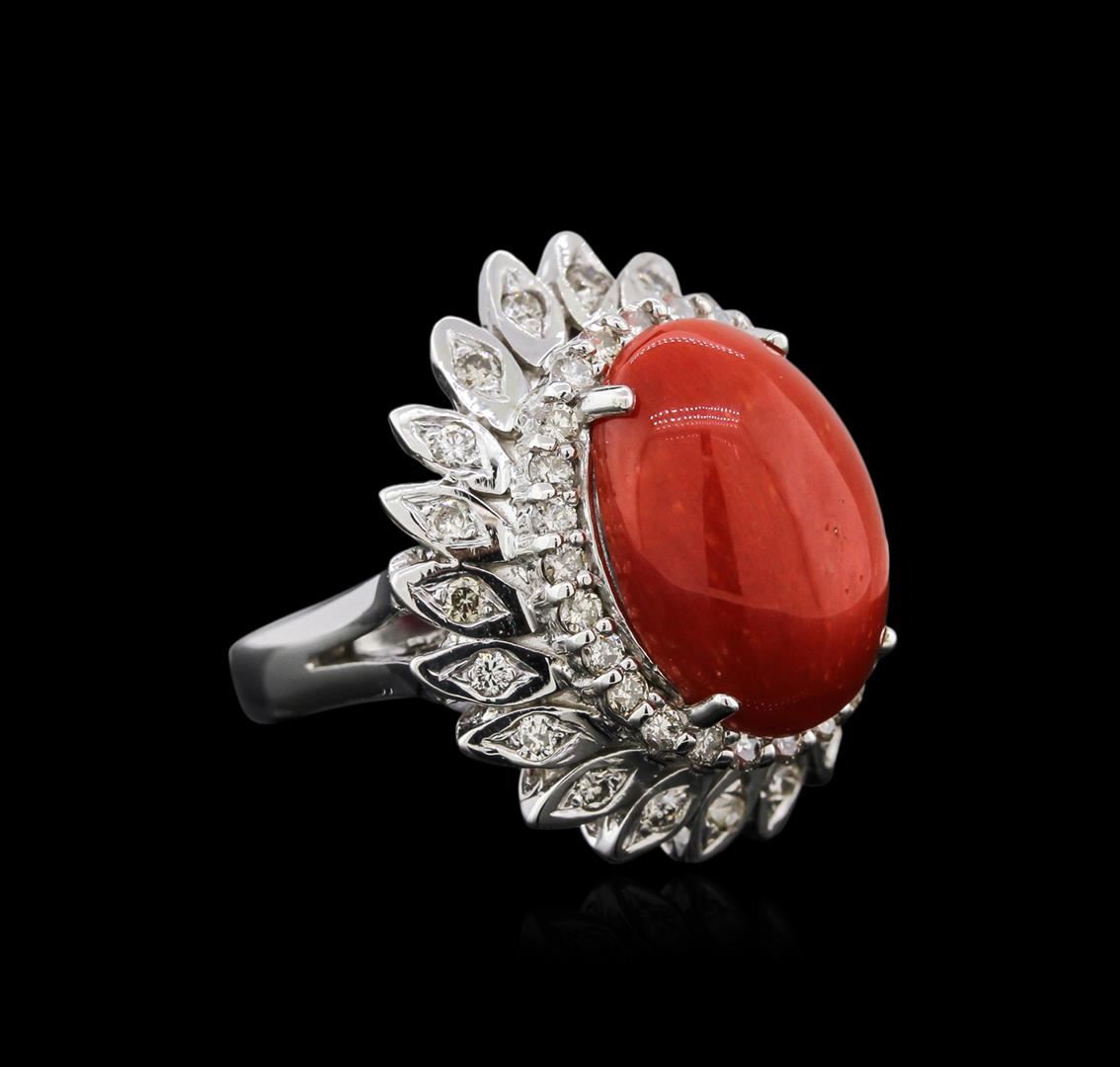 One electronically tested 14KT white gold ladies cast coral and diamond ring with a split shoulder shank with a bright polish finish. Identified with markings of "K14". Condition is new. Containing: One prong set oval cabochon cut natural red coral, measuring 16.34 x 11.04 x 7.18mm, approximate weight of 9.27ct., clarity is severely included, medium dark, brownish, red color, (GIA R 6/1), cut is good. Forty-Six prong set round brilliant cut diamonds, measuring 1.50 - 1.50 x 0.90mm (depth est.) approximate total weight of 46 Stones = 0.57ct. Clarity: I-1 to I-2. Color: L - M, Cut is Good. Diamonds and colored gemstones are graded in the mounting, unless otherwise stated. Colored gemstones are presumed to have been subjected to commonly used enhancement processes. Total Weight of Colored Stones 9.27ct. Total Weight of Diamonds 0.57ct. Total Weight of Ring 12.00 grams. GGL Appraised at $3,855.00.