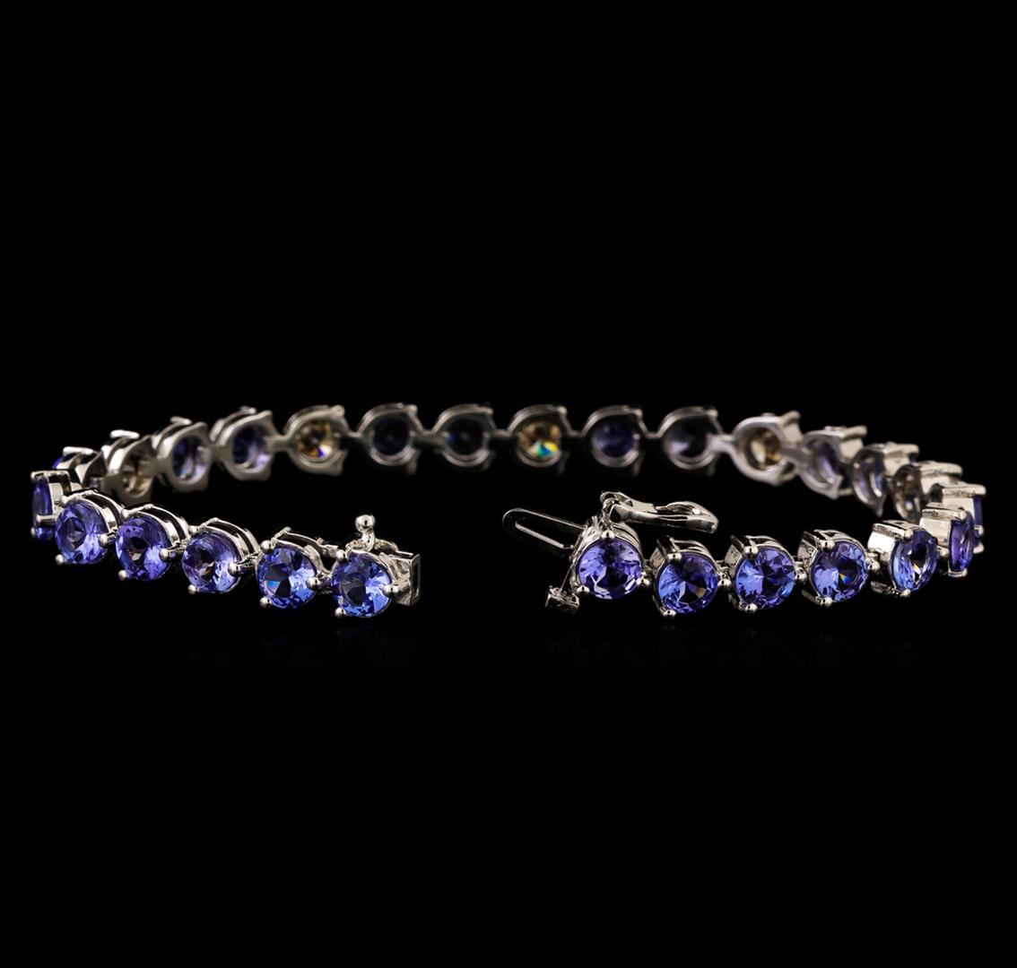 One electronically tested 14KT white gold ladies combination cast & assembled tanzanite and diamond bracelet with a hidden box clasp with safety closer with a bright polish finish. Bracelet measures 7" long. Identified with markings of "14K". Condition is new. Containing: Twenty-two prong set round modified brilliant cut natural tanzanites, measuring 4.87 - 4.99 x 2.71 mm, approximate total weight of 9.46ct., clarity is eye clean, type I, medium light, very slightly grayish, violet color, (GIA V 4/3), cut is good. Five prong set round brilliant cut diamonds, measuring 5.20 - 5.20 x 3.12mm (depth est.) approximate total weight of 5 Stones = 2.57ct. Clarity: I-1 to I-2, Cut is Good. All diamonds and colored gemstones are graded in the mounting, unless otherwise stated. Colored gemstones are presumed to have been subjected to commonly used enhancement processes. Total Weight of Colored Stones 9.46ct. Total Weight of Diamonds 2.57ct. Total Weight of Bracelet 17.70 grams. GGL Appraised.