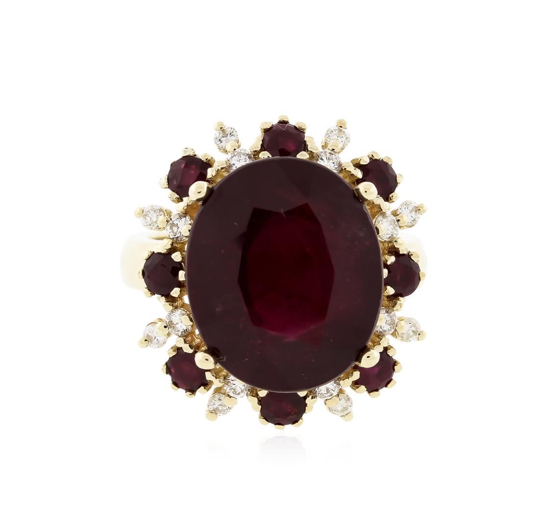 One electronically tested 14KT white gold ladies cast ruby and diamond ring with a bright polish finish. Identified with markings of "14K". Condition is new. Containing: One prong set oval modified brilliant cut natural ruby, measuring 15.00. x 12.00. x 5.88mm, approximate weight of 8.89ct., clarity is heavily included, type II, medium dark, very slightly brownish, strongly purplish red color, (GIA stpR 6/3), cut is good. Eight prong set round modified brilliant cut natural rubies, measuring 2.50 - 2.50 x 1.63 mm, approximate total weight of 0.64ct., clarity is heavily included, medium, moderately strong, strongly purplish red color, (GIA stpR 5/4), cut is good. Sixteen prong set round brilliant cut diamonds, measuring 1.60 - 1.60 x 0.96mm (depth est.) approximate total weight of 16 Stones = 0.24ct. Clarity: SI-1 to SI-2. Color: J - K. Colored gemstones are presumed to have been subjected to commonly used enhancement processes. All diamonds and colored gemstones are graded in the mounting, unless otherwise stated. Total Weight of Colored Stones 9.53ct. Total Weight of Diamonds 0.24ct. Total Weight of Ring 9.30 grams. GGL Appraised at $4,185.00.