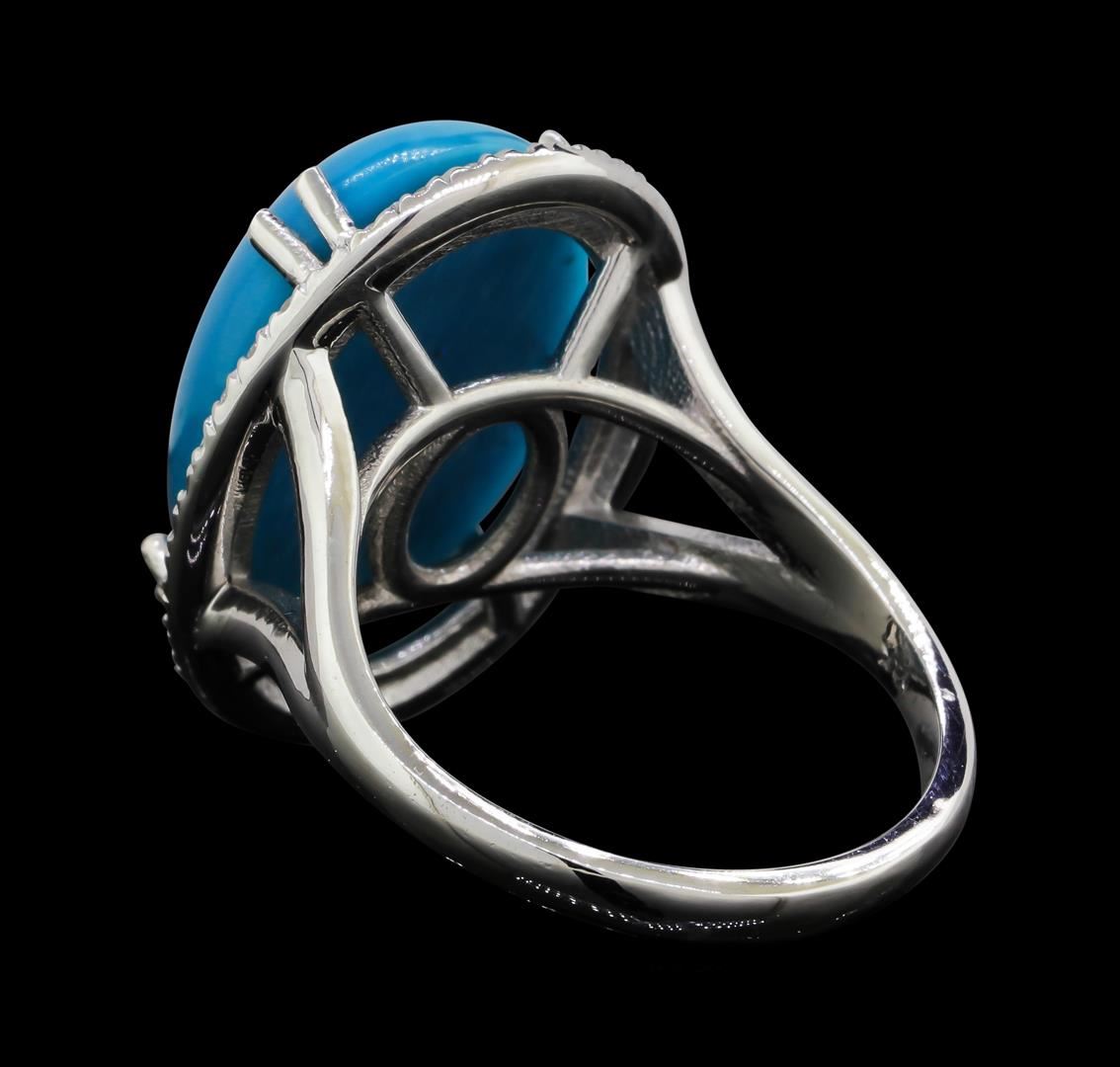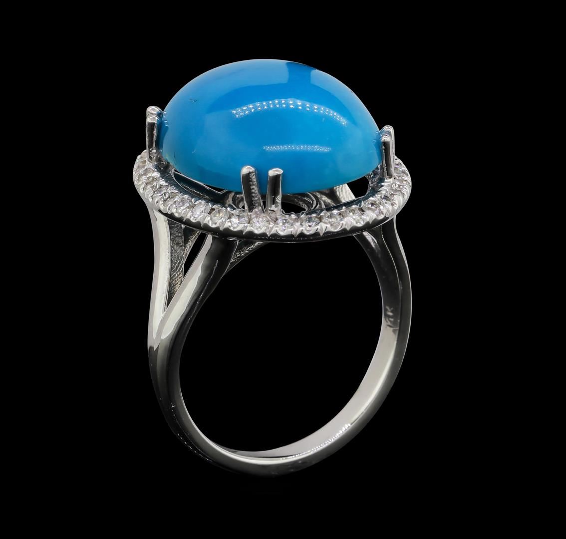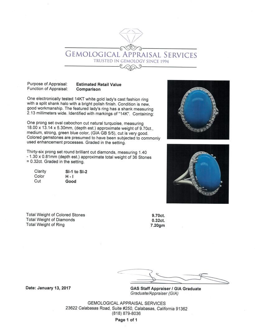 One electronically tested 14KT white gold lady's cast fashion ring with a split shank halo with a bright polish finish. The featured lady's ring has a shank measuring 2.13 millimeters wide. Identified with markings of "14K". Condition is new, good workmanship. Containing: One prong set oval cabochon cut natural turquoise, measuring 18.00 x 13.14 x 5.30mm, (depth est.) approximate weight of 9.70ct., medium, strong, green blue color, (GIA GB 5/5), cut is very good. Colored gemstones are presumed to have been subjected to commonly used enhancement processes. Graded in the setting. Thirty-Six prong set round brilliant cut diamonds, measuring 1.40 - 1.30 x 0.81mm (depth est.) approximate total weight of 36 Stones = 0.32ct. Graded in the setting. Clarity: SI-1 to SI-2. Color: H - ICut Good. Total Weight of Colored Stones 9.70ct. Total Weight of Diamonds 0.32ct. Total Weight of Ring 7.20gm. GAS Appraised.