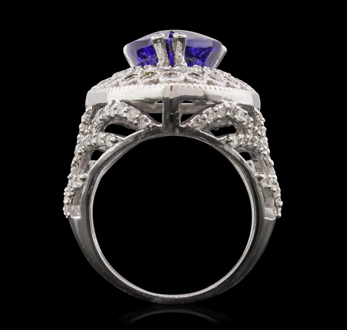 One electronically tested 14KT white gold cast tanzanite & diamond ring with a bright & patterned finish. The featured tanzanite is set within an elaborate multi-tiered diamond bezel, supported by diamond set tapering shoulders, completed by a three millimeter wide band. Identified with markings of "14K". Condition is new, good workmanship. Containing: One prong set pear mixed cut natural tanzanite, measuring 14.00. x 12.00. x 7.90mm, 10%. bulge factor, approximate weight of 9.78ct., clarity is eye clean, type I, dark, moderately strong, violetish blue color, (GIA vB 7/4), cut is good. Transmitting light with no distortion, transparent. Colored Stone Grading Report attached. Graded in the setting. Tanzanite is a very rare gemstone that is only found in the country of Tanzania. Originally discovered in 1967. Tiffany & Company, named the stone Tanzanite. It is found in the Usumburu Mountains that border the Umba Valley of northern Tanzania. Tanzanite occurs in gray, brown, violet, blue, reddish-purple, & green. The gem is interesting because of its exceptional pleochroism. Rotated in different directions a tanzanite will exhibit multiple changes of color. Tanzanite has a low tolerance to ultrasonic cleaning, and should not be cleaned using this method. Twenty bezel set round brilliant cut diamonds, measuring 1.90 - 1.90 x 1.14mm (depth est.) approximate total weight of 20 Stones = 0.50ct. Graded in the setting. Clarity: SI-1 to SI-2 One Hundred Twenty prong set round brilliant cut diamonds, measuring 1.90 - 1.35 x 0.98mm (depth est.) approximate total weight of 120 Stones = 1.70ct. Graded in the setting. Clarity: SI-2 to I-2 . Color: G - I. Total Weight of Colored Stones 9.78ct. Total Weight of Diamonds 2.20ct. Total Weight of Ring 10.20 grams. AIG Appraised.