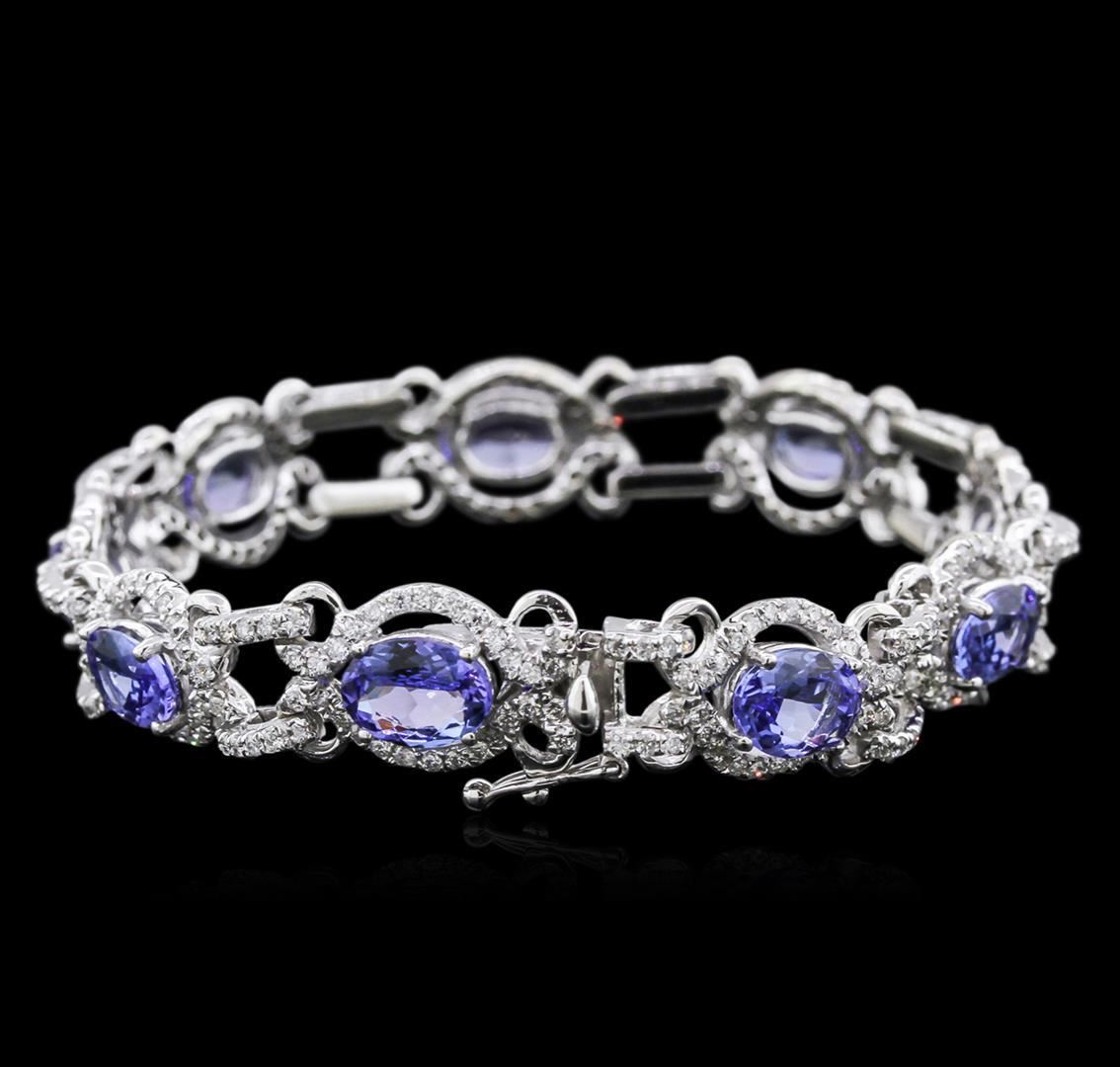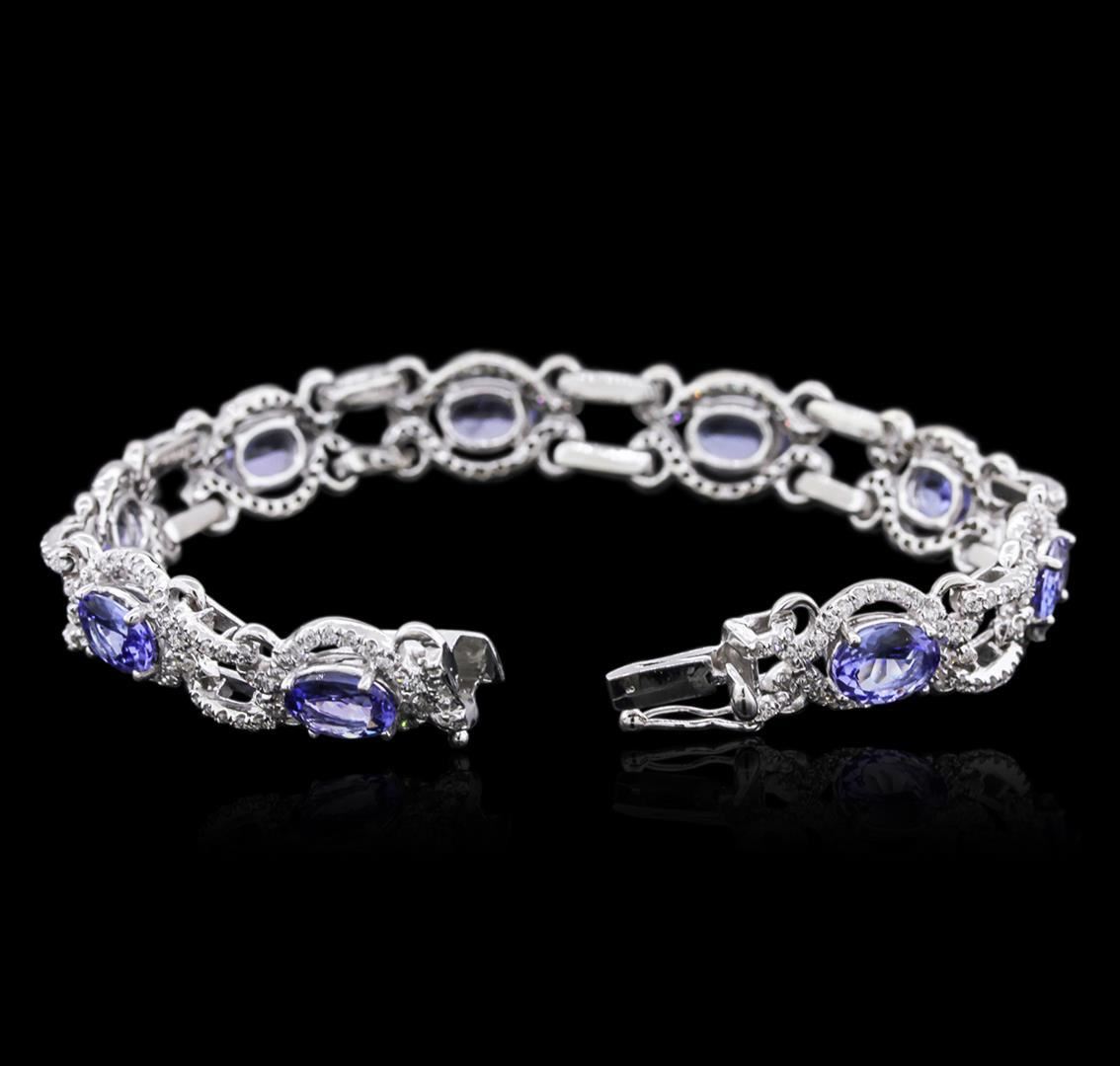 One electronically tested 14KT white gold ladies cast tanzanite and diamond bracelet with a hidden box clasp with safety closer with a bright polish finish. Measurements: 7 inches in length. Condition is new. Containing: Nine prong set oval modified brilliant cut natural tanzanites, measuring 7.90 x 5.70 x 3.71mm, approximate total weight of 9.85ct., clarity is eye clean, type I, medium, very slightly grayish, violet color, (GIA V 5/3), cut is good. Three Hundred Fifty-Six prong set round brilliant cut diamonds, measuring 1.30 - 1.30 x 0.78mm (depth est.) approximate total weight of 356 Stones = 2.76ct. Clarity: SI-1 to I-1. Color: G - H, Cut is Good. Colored gemstones are presumed to have been subjected to commonly used enhancement processes. All diamonds and colored gemstones are graded in the mounting, unless otherwise stated. Total Weight of Colored Stones 9.85ct. Total Weight of Diamonds 2.76ct. Total Weight of Bracelet 21.40 grams. GGL Appraised.