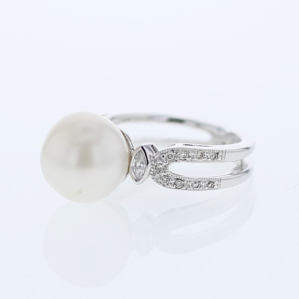 One 14KT White Gold 9.90ct Pearl and Diamond Ring. (1) White Pearl with a total weight of 9.90cts. (20) Diamonds with a total weight of 0.27cts with a color of I and clarity of SI-1 to SI-2. Total weight of this ring is 4.4 grams.