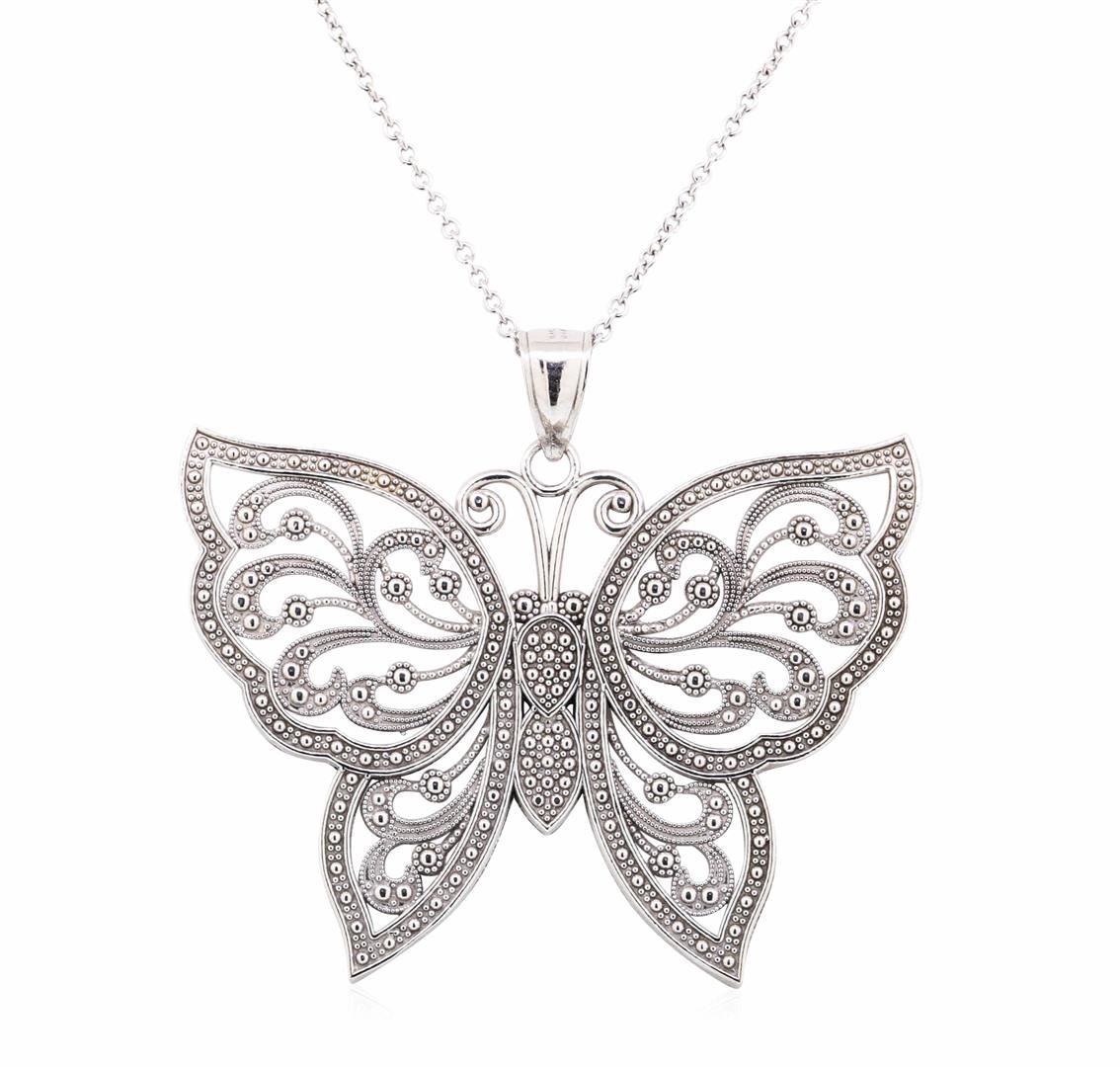 One butterfly pendant with chain featuring: 14KT white gold weighing 7.8 grams. The chain is a rounded cable link chain measuring approximately eighteen inches in length.