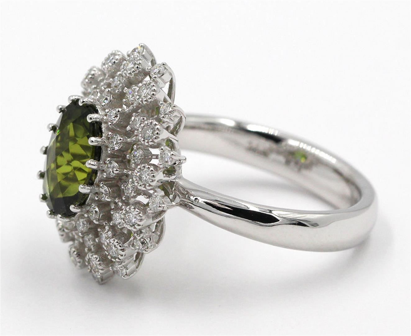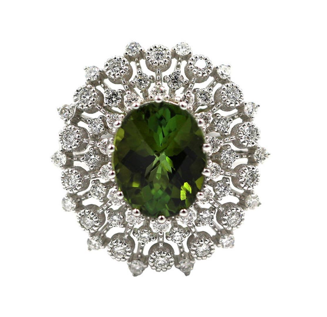 One Natural Oval Cut Green Tourmaline Anniversary Diamond Ring in 14k White Gold. Ring is size 6.5 but resizable. Total carat weight of ring is 2.71 Ct. Setting style is 4 prong with accent equating a total gross weight of 6.68 grams. Total stones is 57 and condition is brand new. Main stone is natural and non-enhanced, 2.20 Ct, oval shape, fine-bright clarity, and color is green tourmaline. Size approximation of main stone is 9.00 x 7.00 MM. Main stone cut is excellent. Side stone is natural and non-enhanced, total 0.51 carats, shape is brilliant round cut, clarity is SI1, color is G-H, cut is excellent, and has 56 stones.
