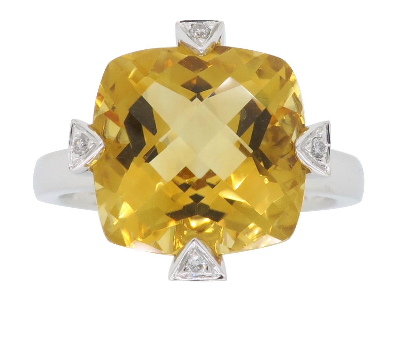 One 14KT White Gold Citrine and Diamond Ring. (1) Cushion shaped Citrine stone measuring 10.75mm. Round Diamonds with a total weight of 0.02cts with a color of G-I and clarity of I-1. Total weight of ring is 4.5 grams. Ring size is 6.25.