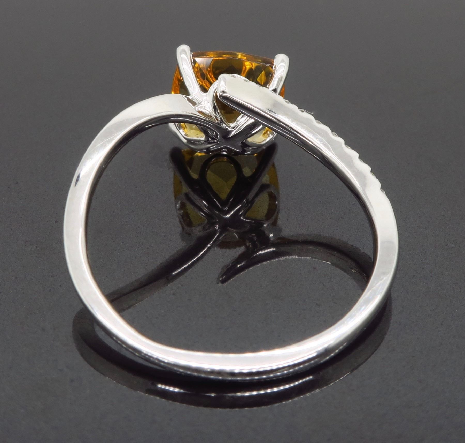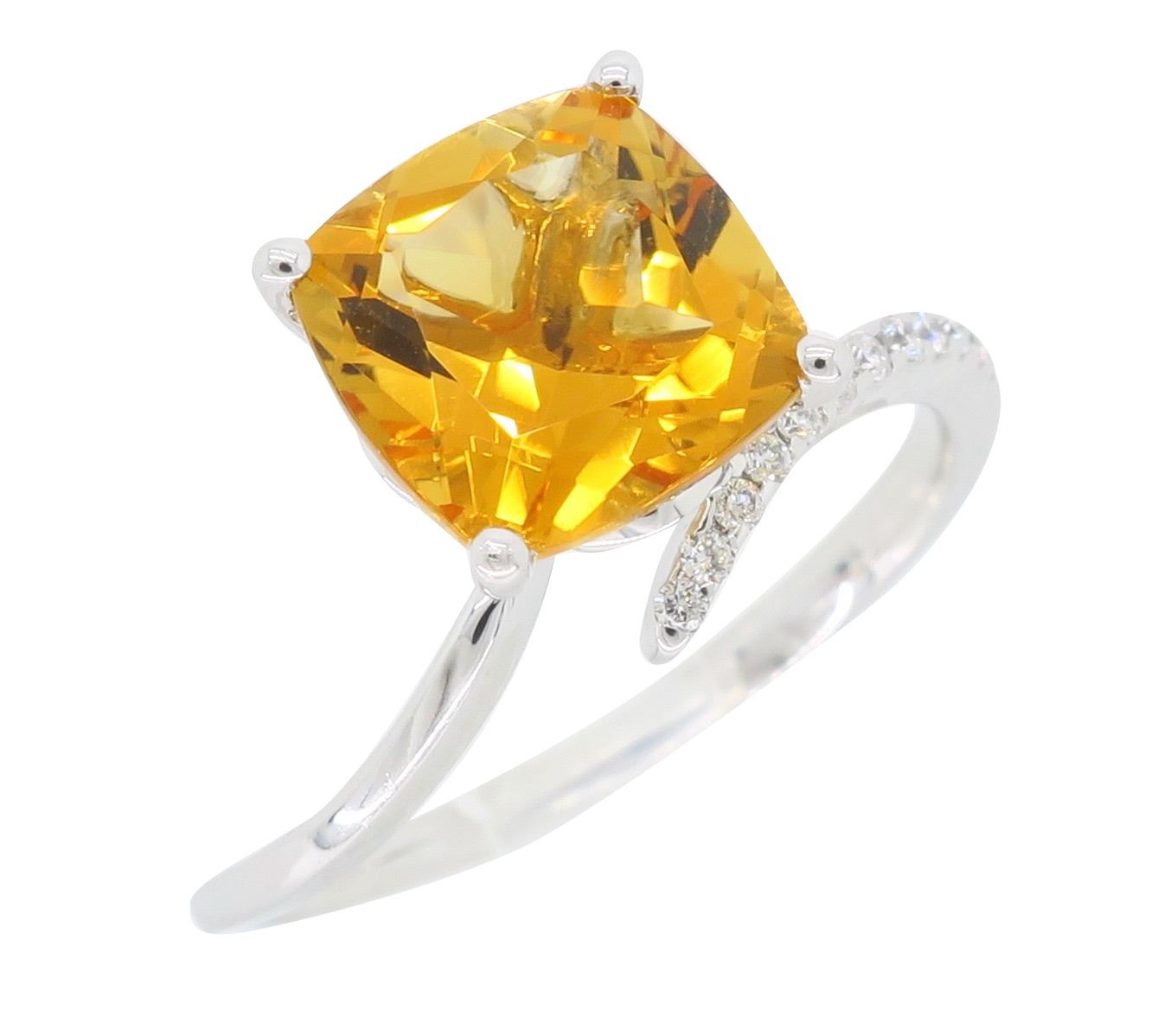 One 14KT White Gold Citrine and Diamond Ring. (1) Cushion shaped Citrine stone measuring 8mm. Round Diamonds with a total weight of 0.06cts with a color of G-H and clarity of VS-2 to SI-1. Total weight of ring is 2.3 grams. Ring size is 6.25.