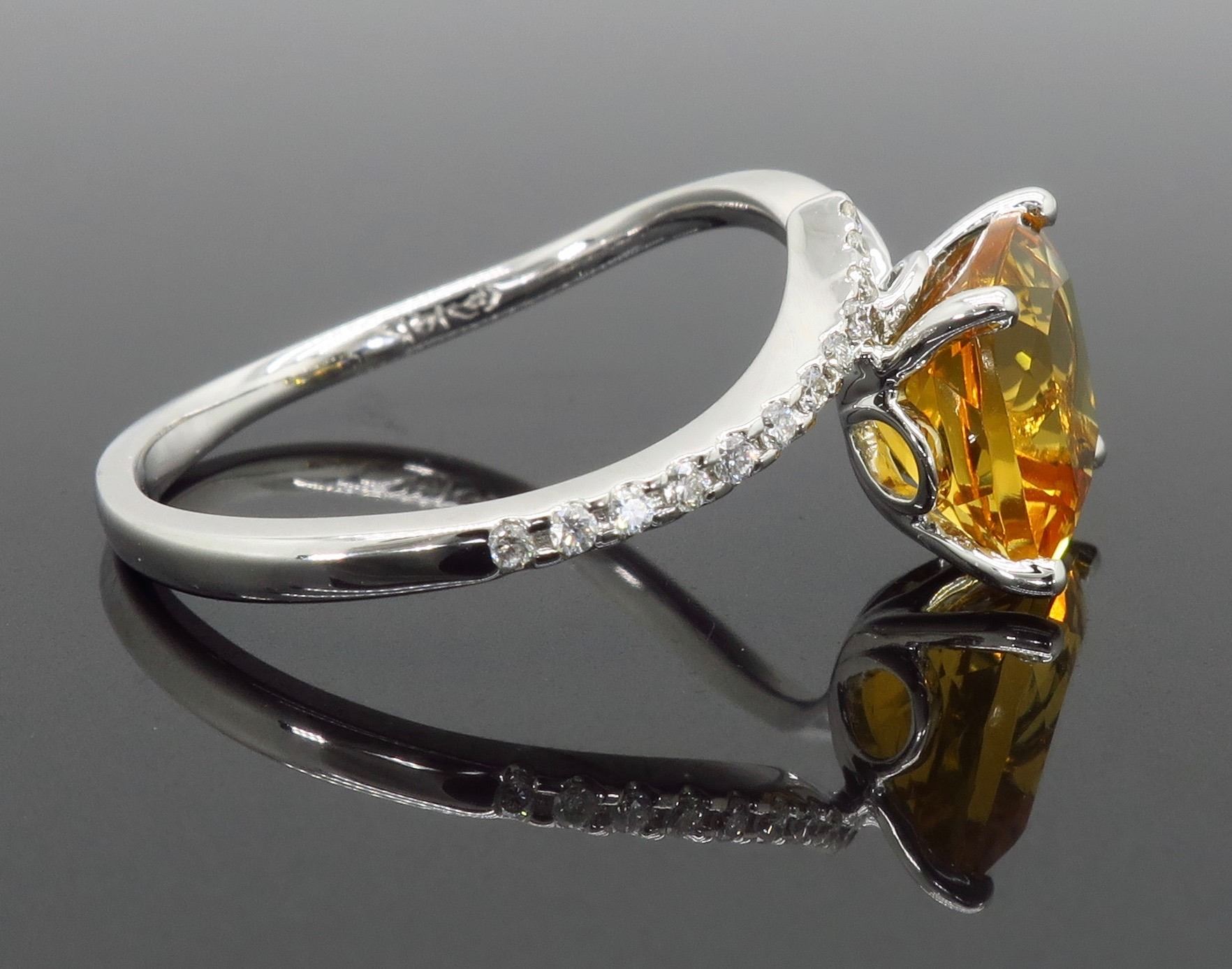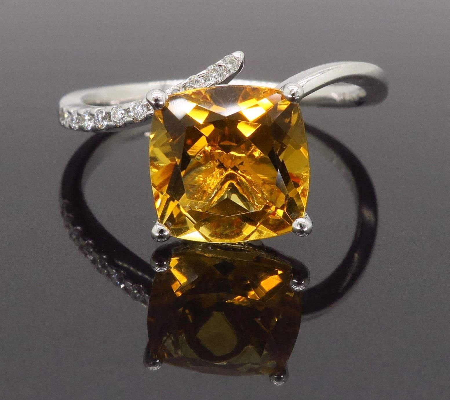 One 14KT White Gold Citrine and Diamond Ring. (1) Cushion shaped Citrine stone measuring 8mm. Round Diamonds with a total weight of 0.06cts with a color of G-H and clarity of VS-2 to SI-1. Total weight of ring is 2.3 grams. Ring size is 6.25.