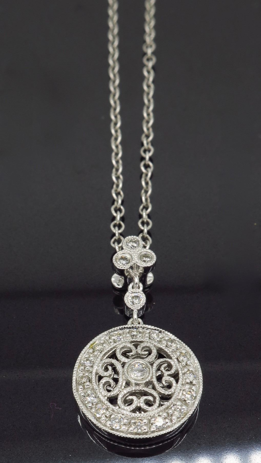 One 14KT White Gold Diamond Pendant with Chain. (21) round Diamonds with a total weight of 0.16cts with a color of H-J and clarity of SI-1. Total weight of this pendant is 4.3 grams. Total length of this chain is 18.5 inches. Total Length of this pendant is 0.75 inches.