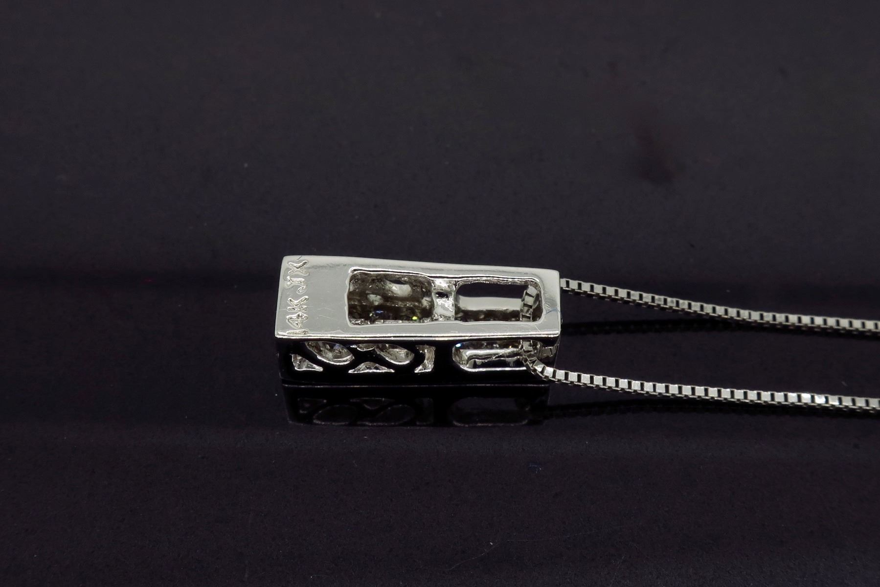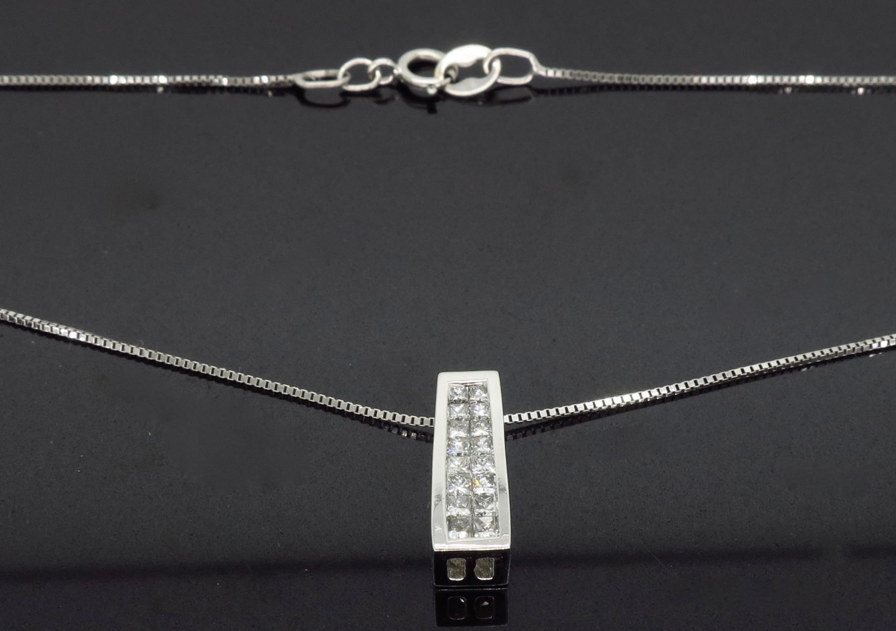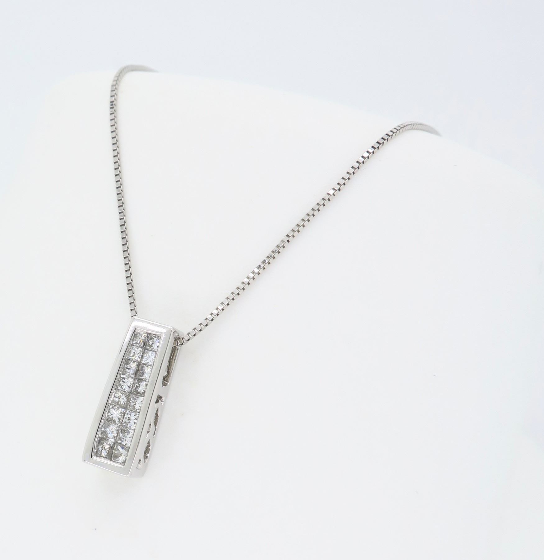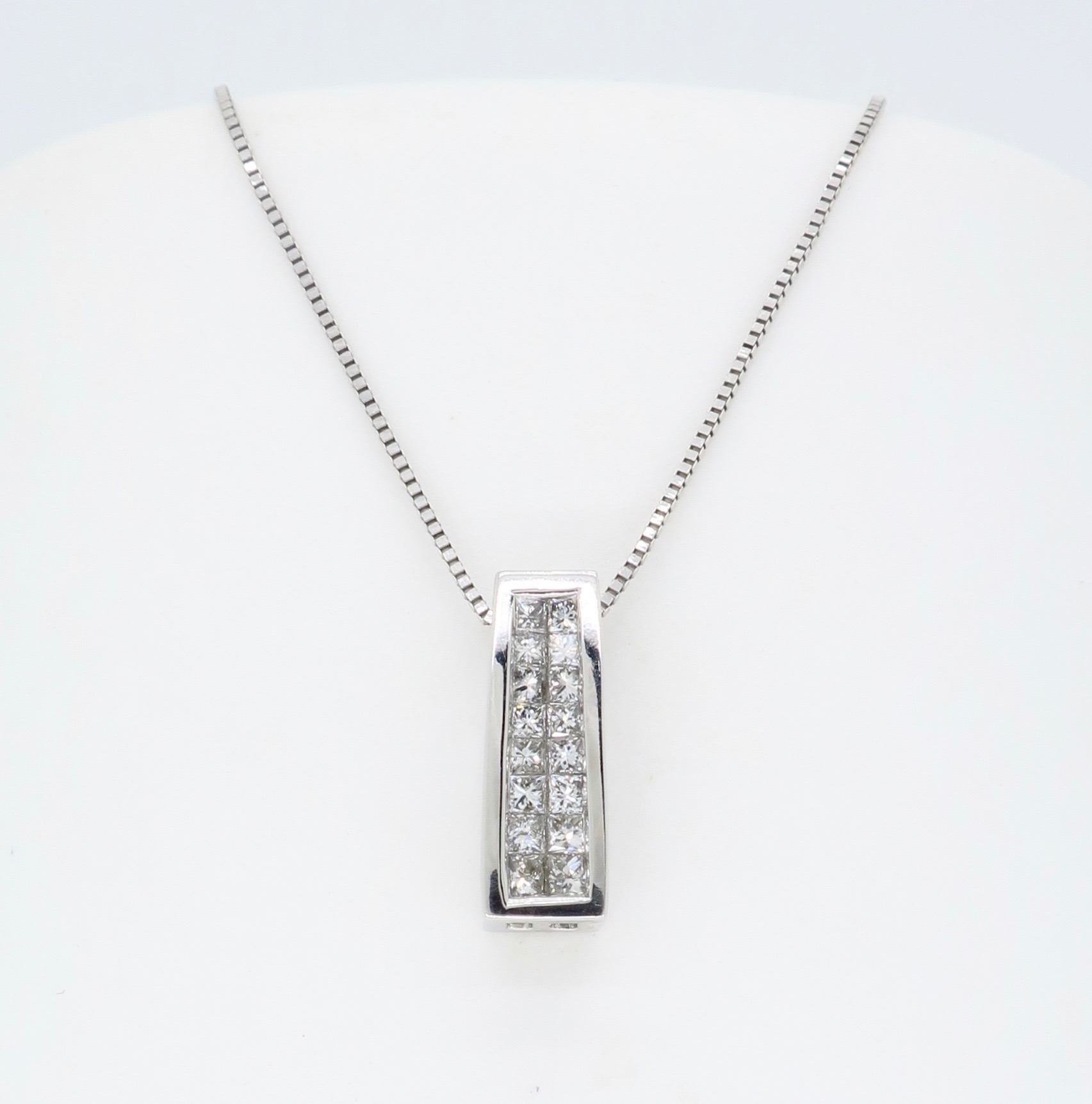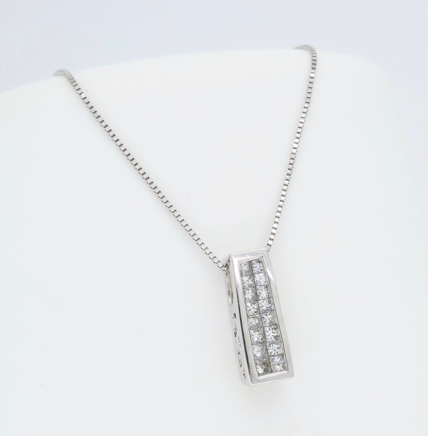 One 14KT White Gold Diamond Pendant with Chain. (16) Princess cut Diamonds with a total weight of 0.24cts with a color of G-I and clarity of SI-1. Total weight of this pendant is 2.7 grams. Total length of this chain is 18.5 inches. Total Length of this pendant is 0.50 inches.