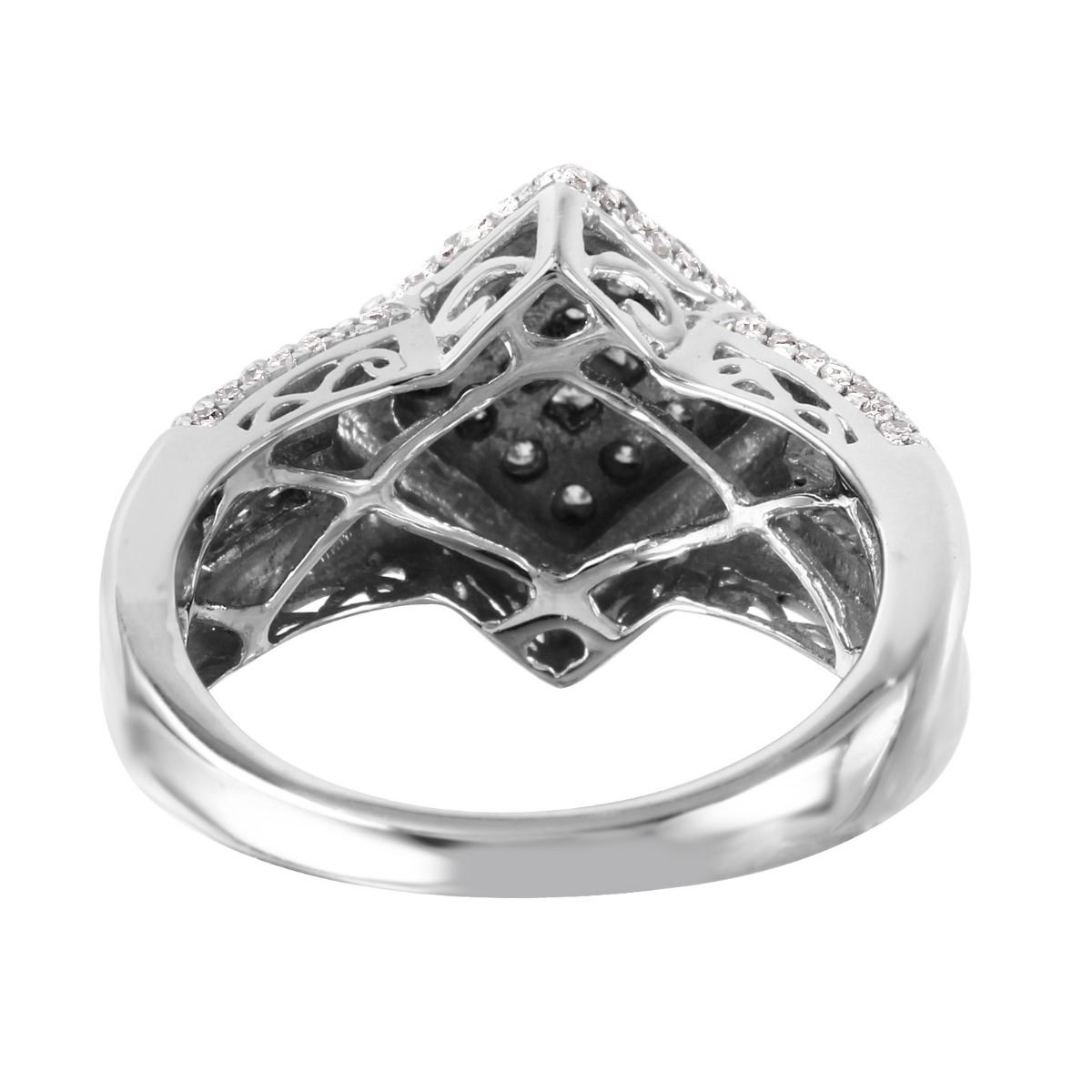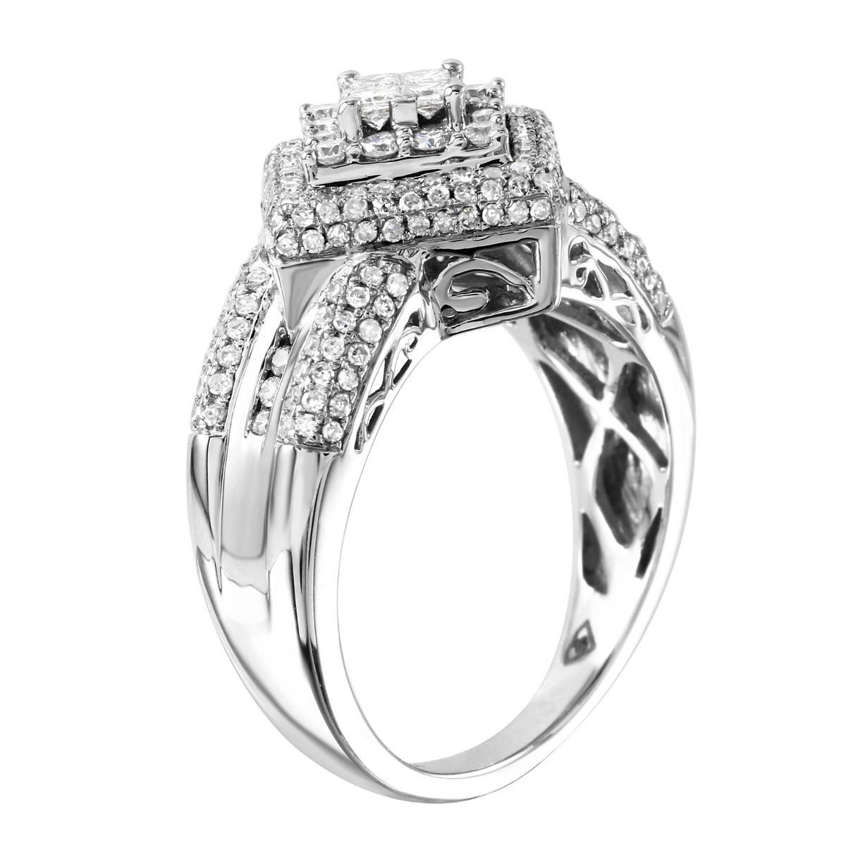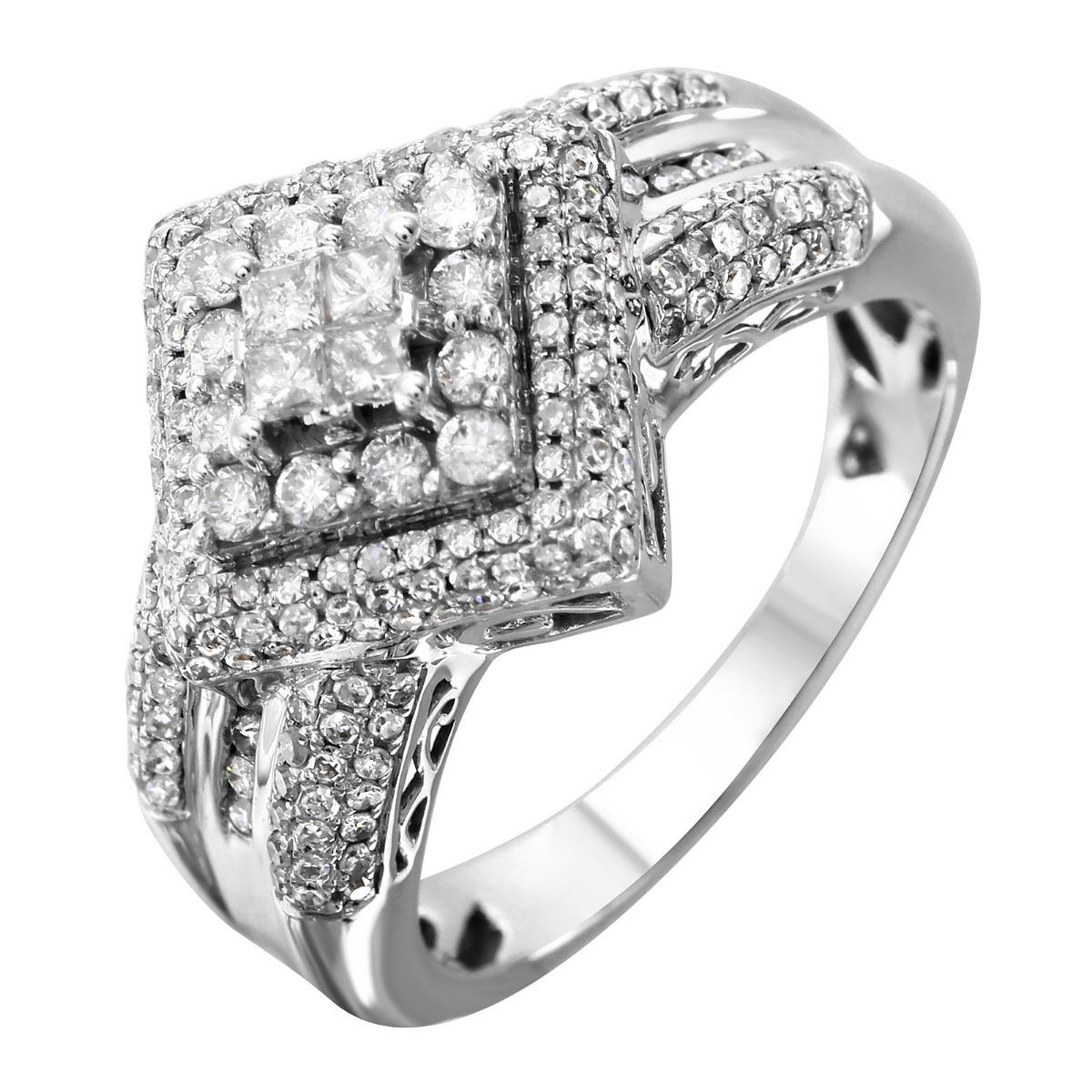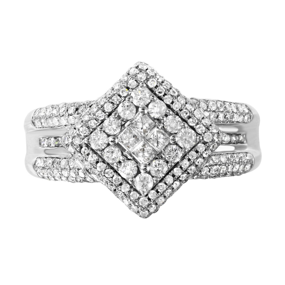One stamped & tested 14KT white gold ladies cast diamond ring with a bright polish finish. Ring size 6.75 (sizeable). Identified with markings of "14K". Condition is new. Containing: Four prong set princess cut diamonds, measuring 1.50 x 1.50 x 1.13mm (depth est.) approximate total weight of 4 Stones = 0.10ct. Clarity: I-1. Color: H, Cut is Very Good. Twelve prong set round brilliant cut diamonds, measuring 2.00 - 2.00 x 1.20mm (depth est.) approximate total weight of 12 Stones = 0.35ct. Clarity: SI-1 to SI-3. Color: G - H, Cut is Very Good. One Hundred Seventy prong set round brilliant cut diamonds, measuring 1.00 - 1.00 x 0.60mm (depth est.) approximate total weight of 170 Stones = 0.55ct. Clarity: SI-1 to SI-3. Color: G - H, Cut is Good. Approximate Total Weight of Diamonds 1.00ct. Total Weight of Ring 6.50gm. The descriptions listed should not be construed as an appraisal. The detail is provided as a guideline for color, clarity, weights and measurements to the best of our ability. We welcome inspections. WE SHIP WORLDWIDE!