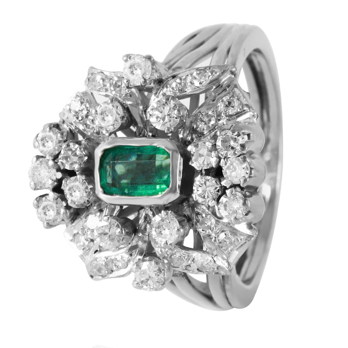 One electronically tested 14KT white gold ladies cast emerald and diamond ring with a bright polish finish. Condition is very good. Containing: One bezel set emerald standard step cut natural emerald, measuring 5.50 x 3.50 x 2.28mm, approximate total weight of 0.32ct., clarity is moderately included, type III, light, very slightly grayish, green color, Sixteen prong set single cut diamonds, measuring 1.30 - 1.30 x 0.78mm (depth est.) approximate total weight of 16 Stones = 0.13ct. Clarity: I-1 to I-2. Color: H - I. Sixteen prong set round brilliant cut diamonds, measuring 2.00 - 2.00 x 1.20mm (depth est.) approximate total weight of 16 Stones = 0.47ct. Clarity: SI-2 to I-1. Color: I - J. Approximate Total Weight of Colored Stones 0.32ct. Approximate Total Weight of Diamonds 0.60ct. Total Weight of Ring 6.50gm. Ring Size 7. The descriptions listed should not be construed as an appraisal. The detail is provided as a guideline for color, clarity, weights and measurements to the best of our ability. We welcome inspections. WE SHIP WORLDWIDE!
